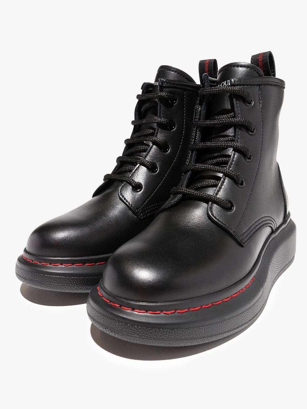 Rund tå, snørelukning foran, kontraststing, hæltræk, oversized sål. Materiale: læder.