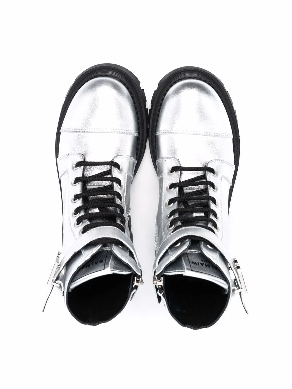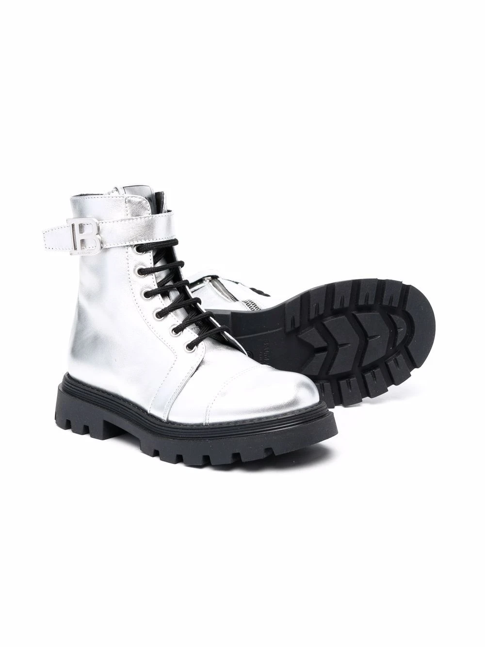 Logoplade, rund tå, snørelukning foran, lynlåslukning i siden, logomærke på pløsen, ankellængde, rillet gummisål. Materiale: læder.