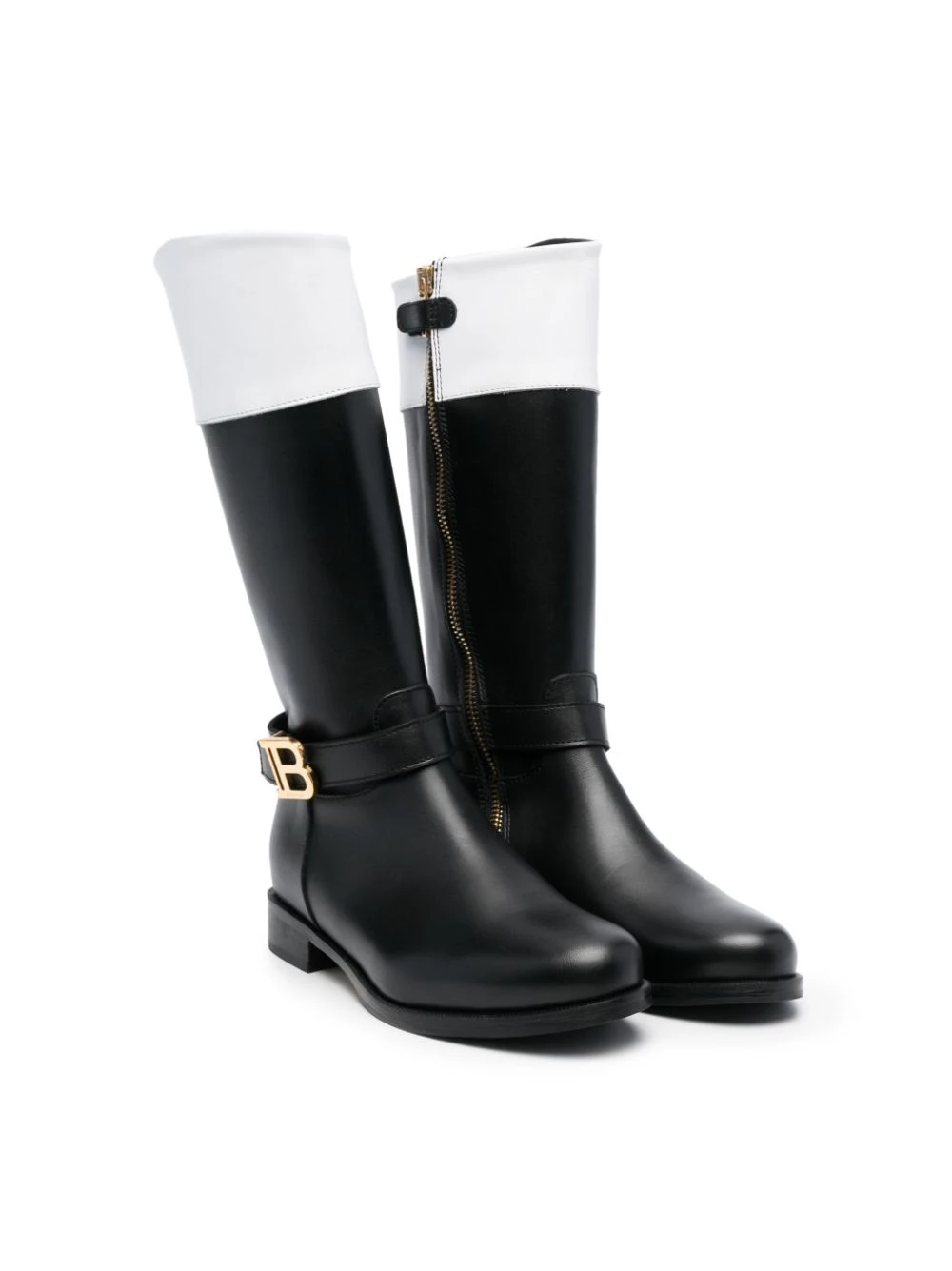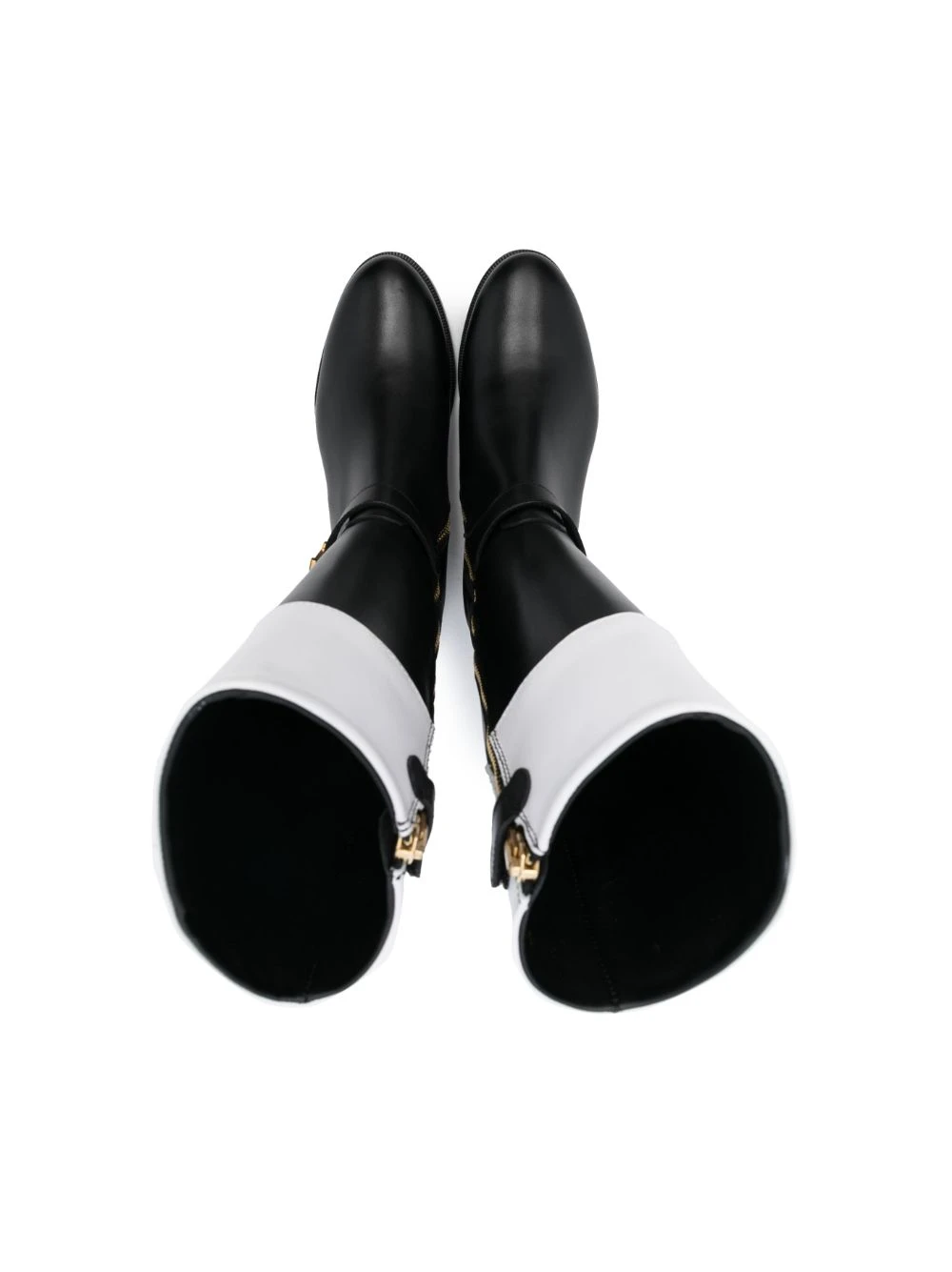 Sort, guldfarvet, kalveskind, tofarvet design, guldtonet logoplade, lynlåslukning i siden, rund tå, indersål med logo, flad gummisål.