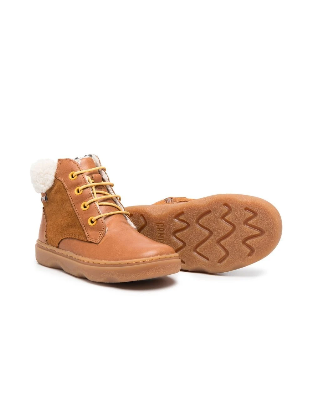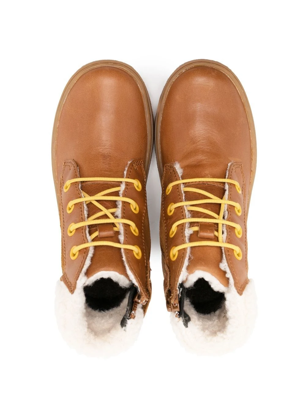 Cognac-brun, kalveskind, imiteret lammeskindsfor, snørelukning foran, rund tå, flad gummisål.