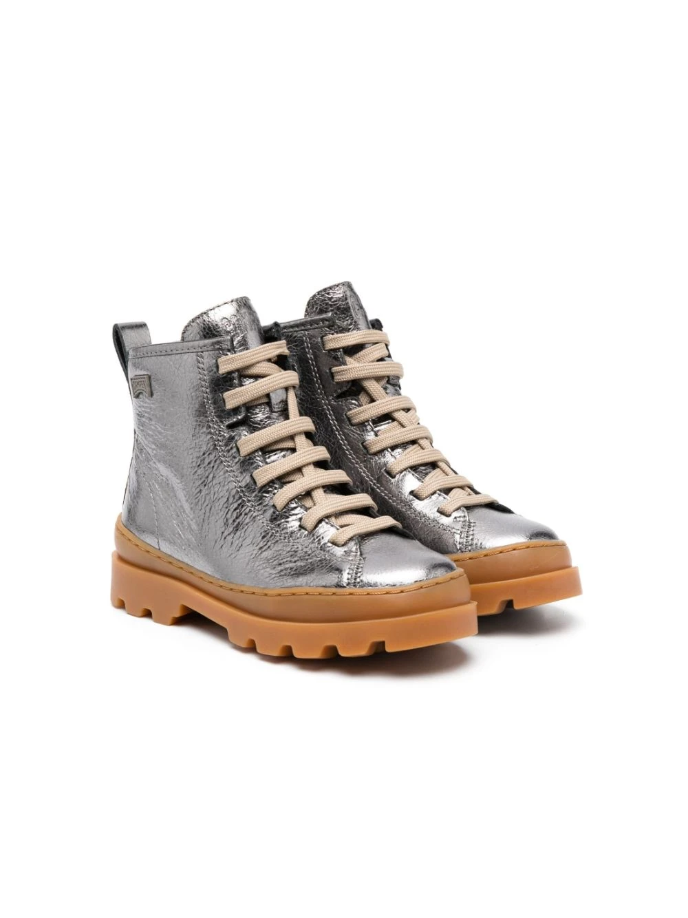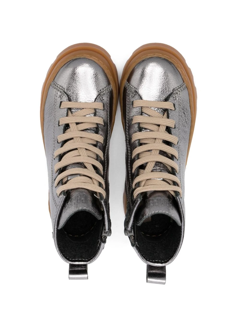 Sølvfarvet, genanvendt polyester, kalveskind, metallisk effekt, rund tå, snørelukning foran, ankellængde, rillet gummisål.