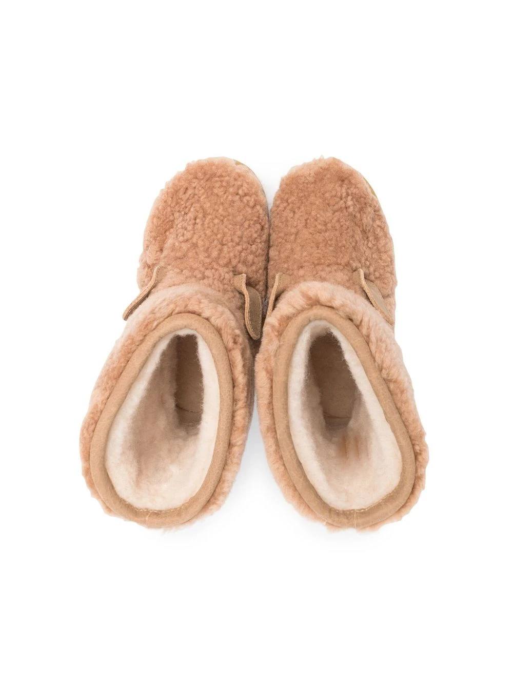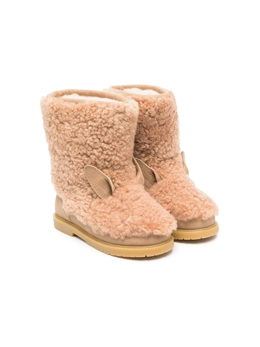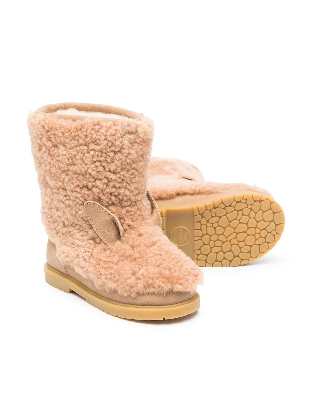 Beige, lammeskindsdetalje, pop up-dyreører, rund tå, flad gummisål, pull on-design.