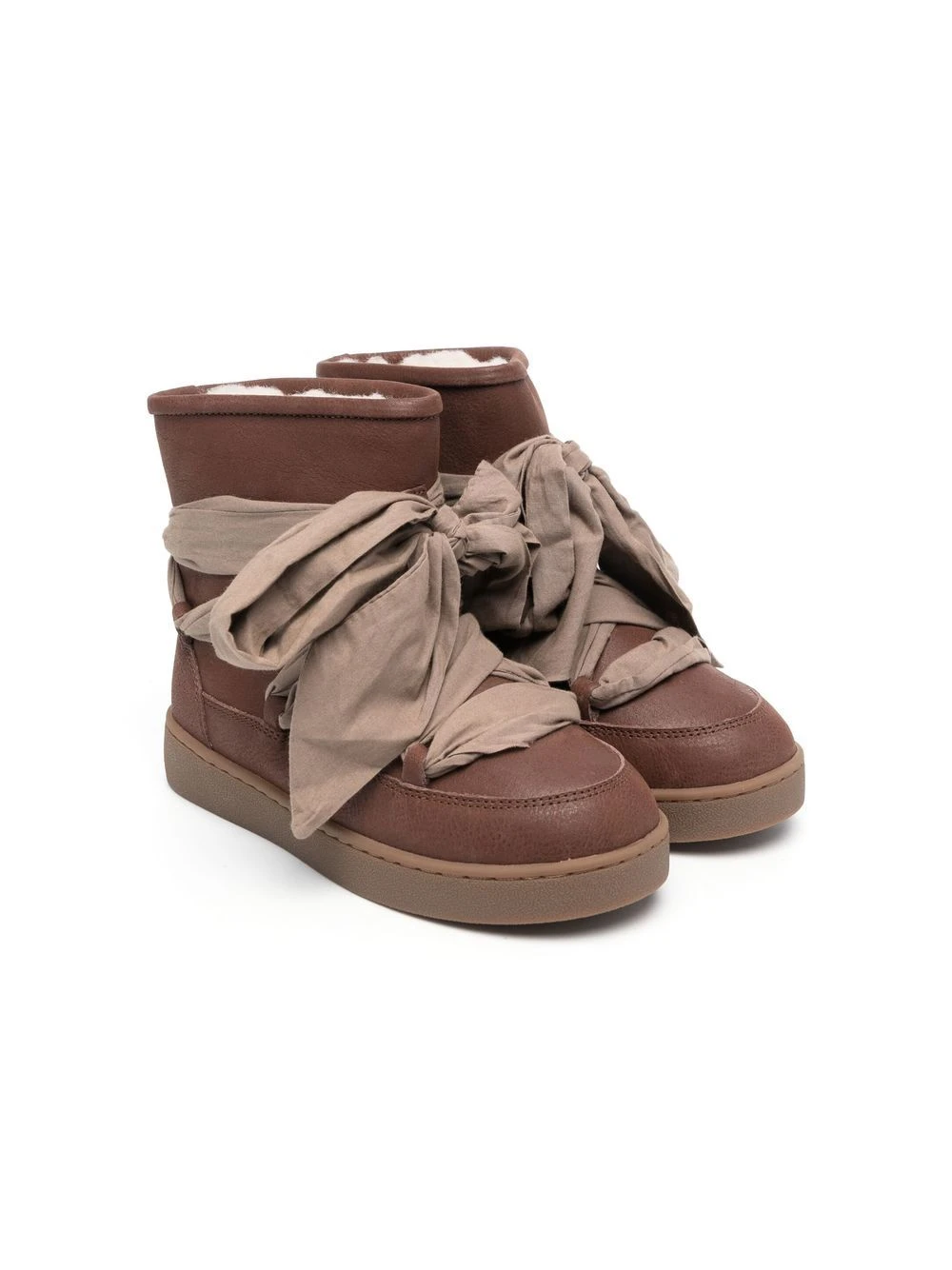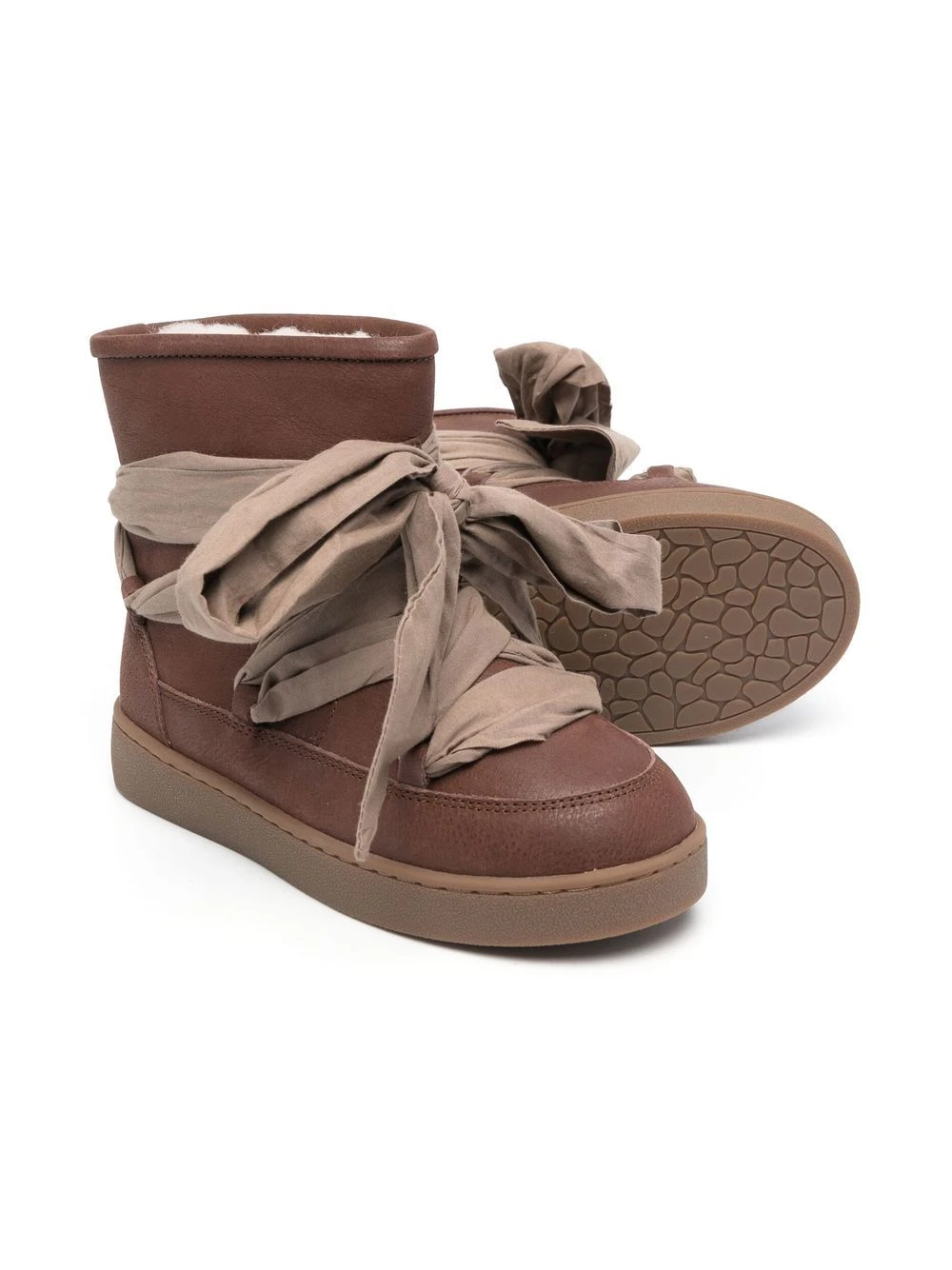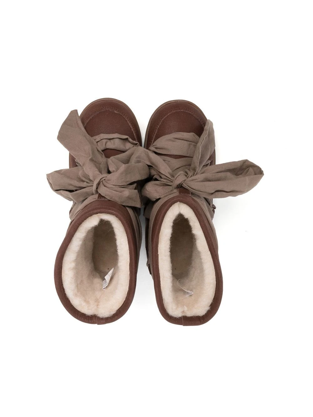 Chokoladebrun, læder, imiteret pelsfor, detalje i imiteret pels, snørelukning foran, rund tå, flad gummisål, ankellængde, pull on-design.