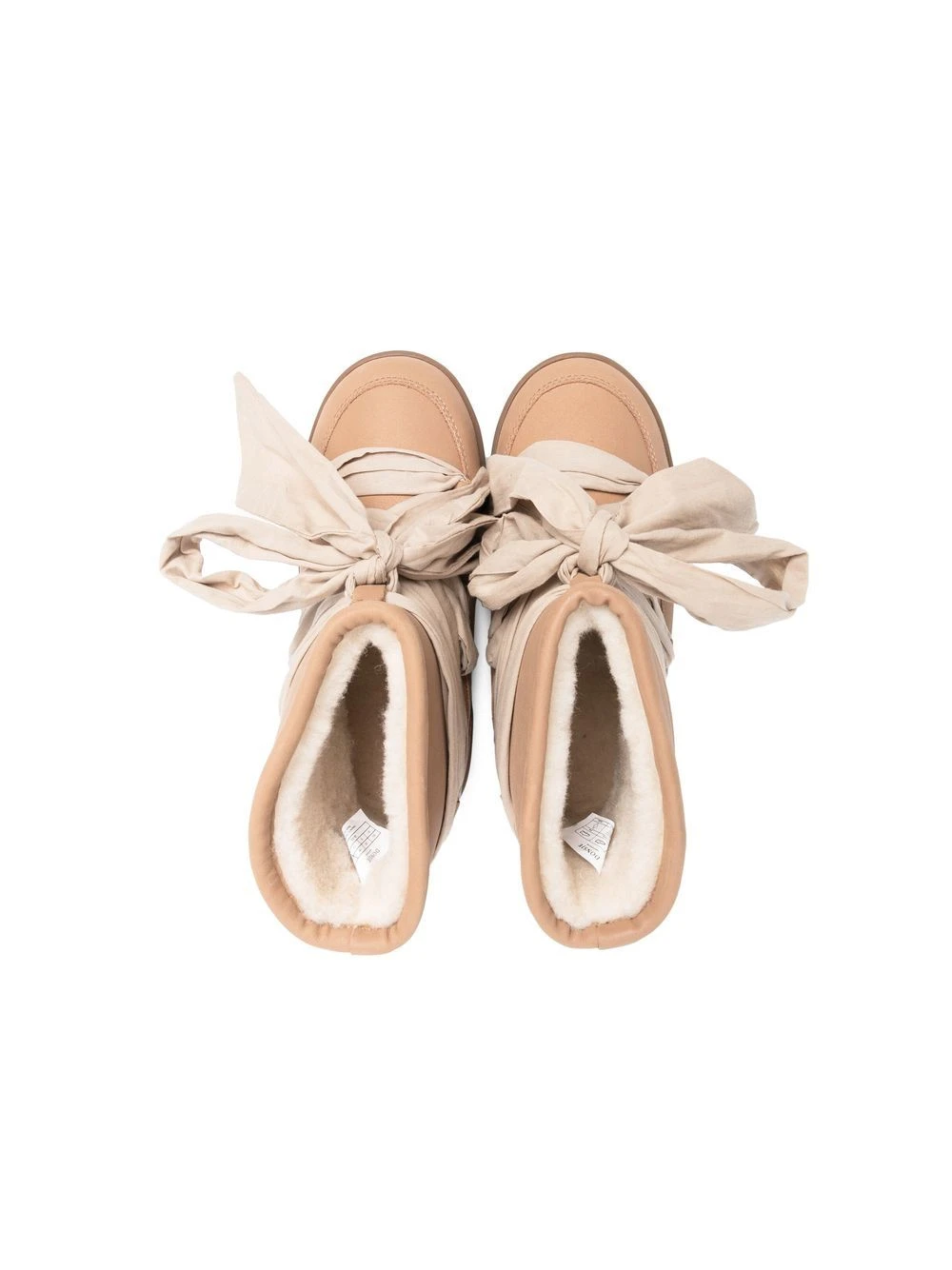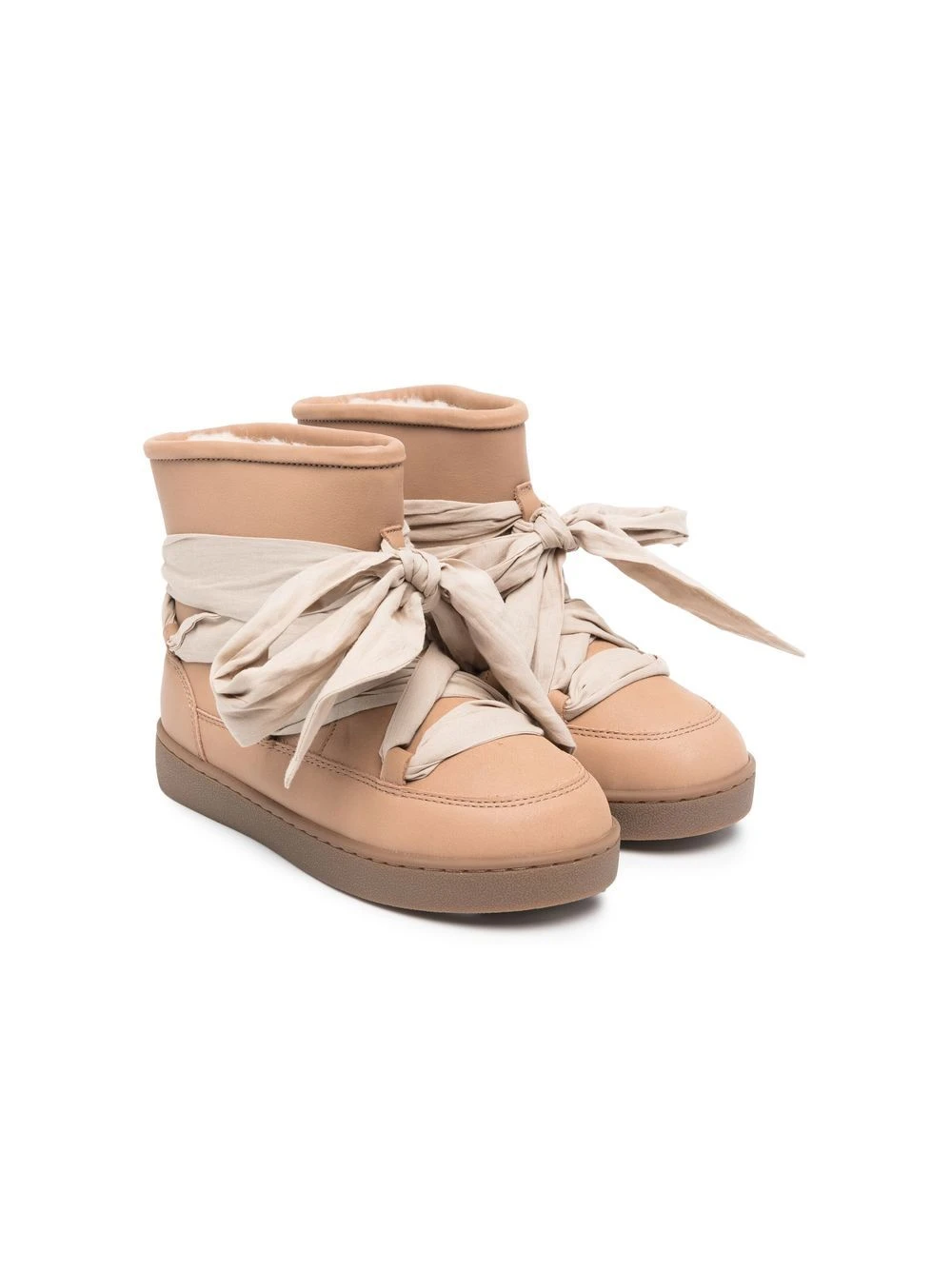 Læder, imiteret pelsfor, snørelukning foran, rund tå, flad gummisål, ankellængde, pull on-design.