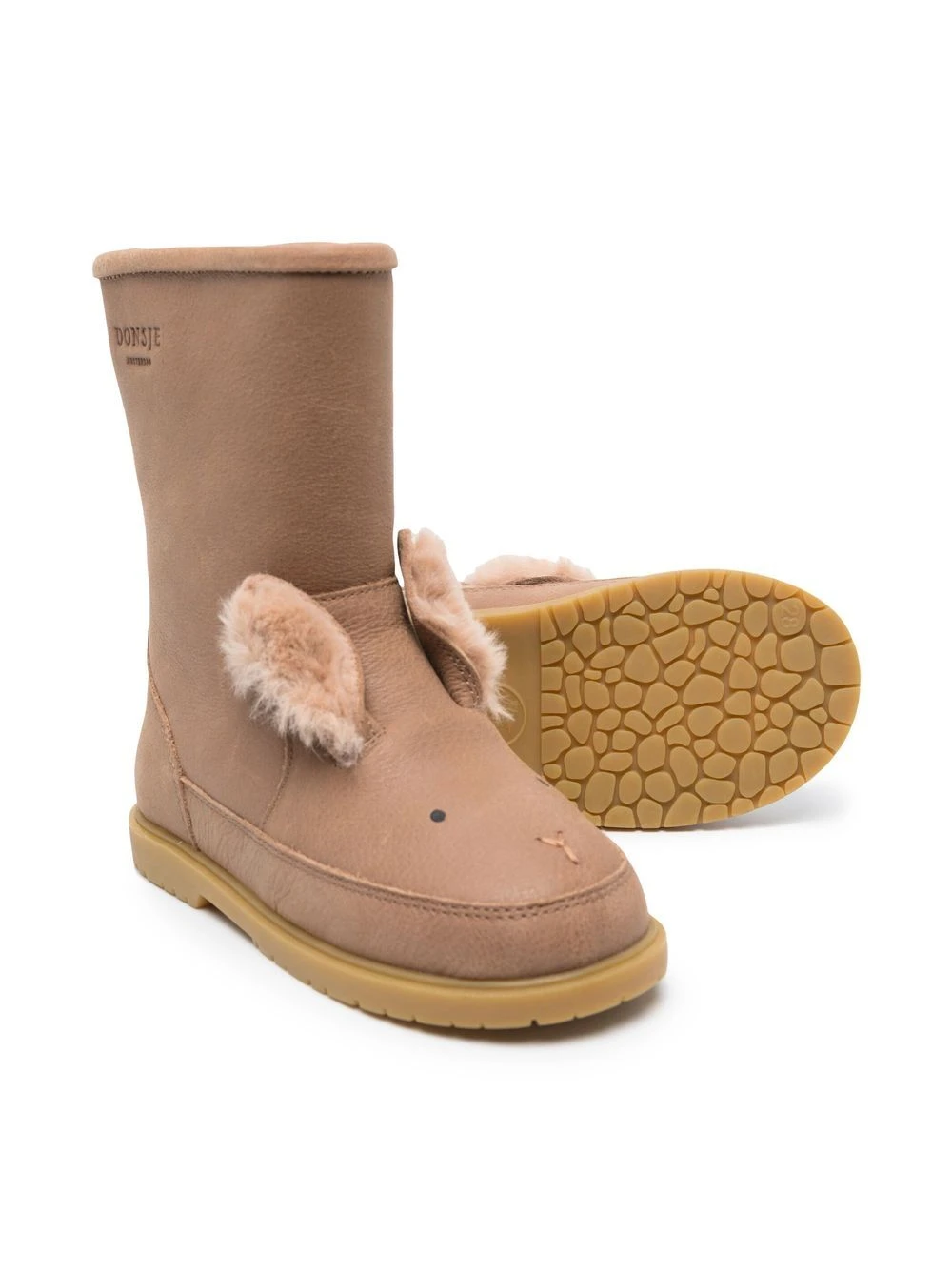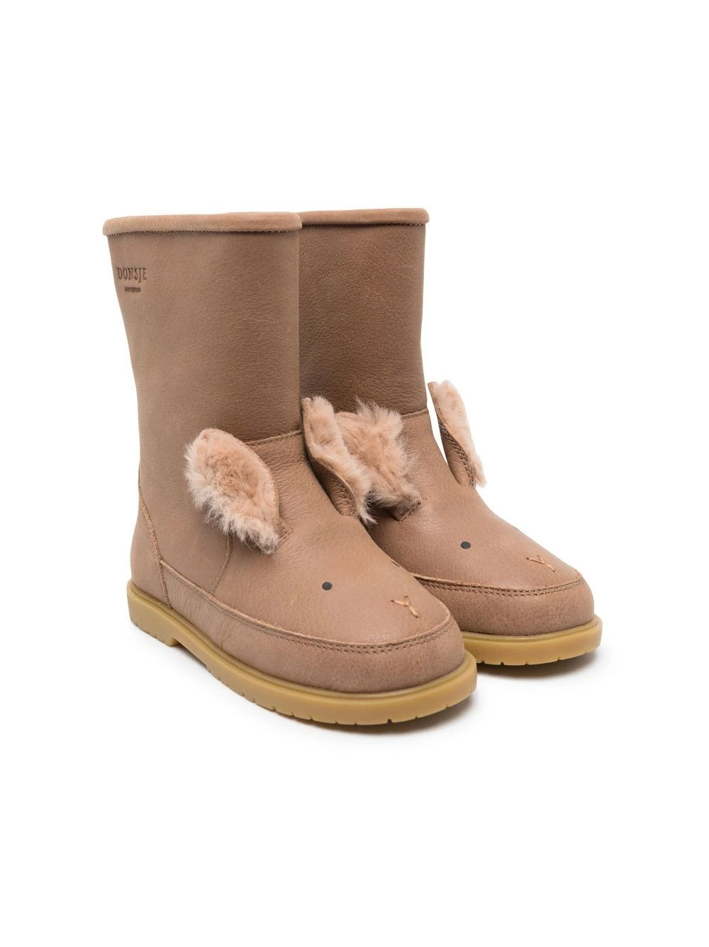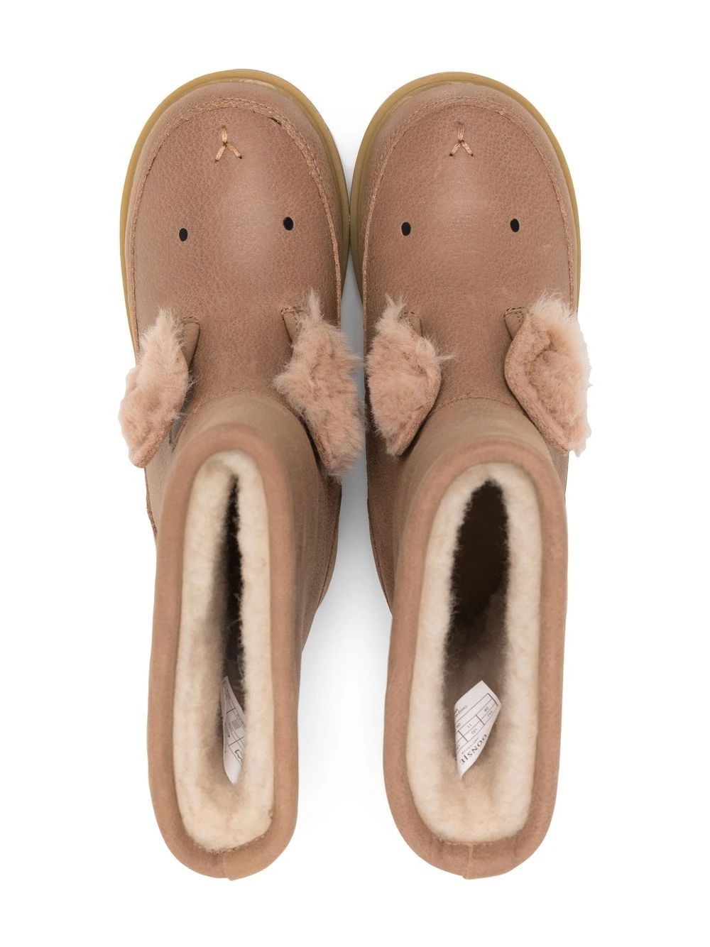 Lysebrun, læder, lammeskind, præget logo i siden, rund tå, slip-on-design, indersål med logo, flad gummisål.