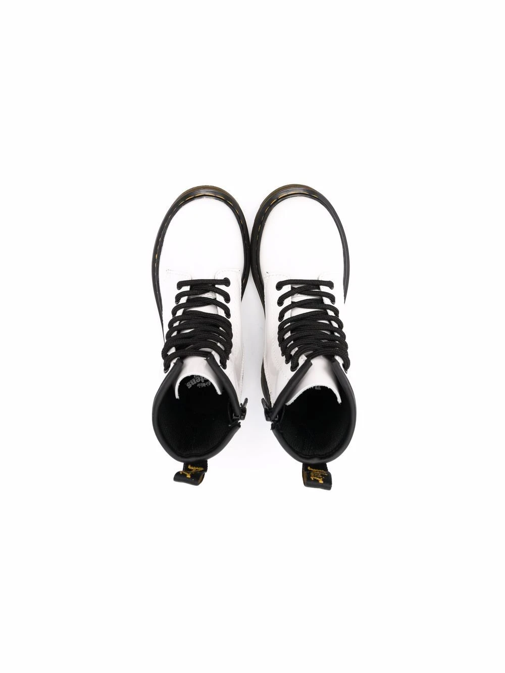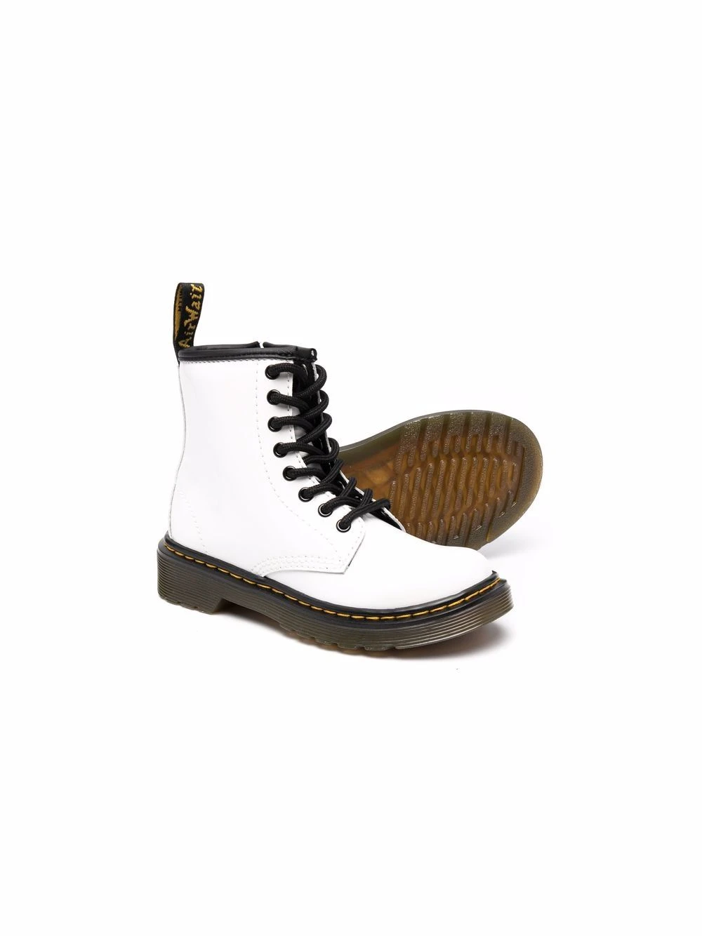 Rund tå, snørelukning foran, lynlåslukning i siden, indersål med logo, hæltræk, flad gummisål. Materiale: lakeret læder.