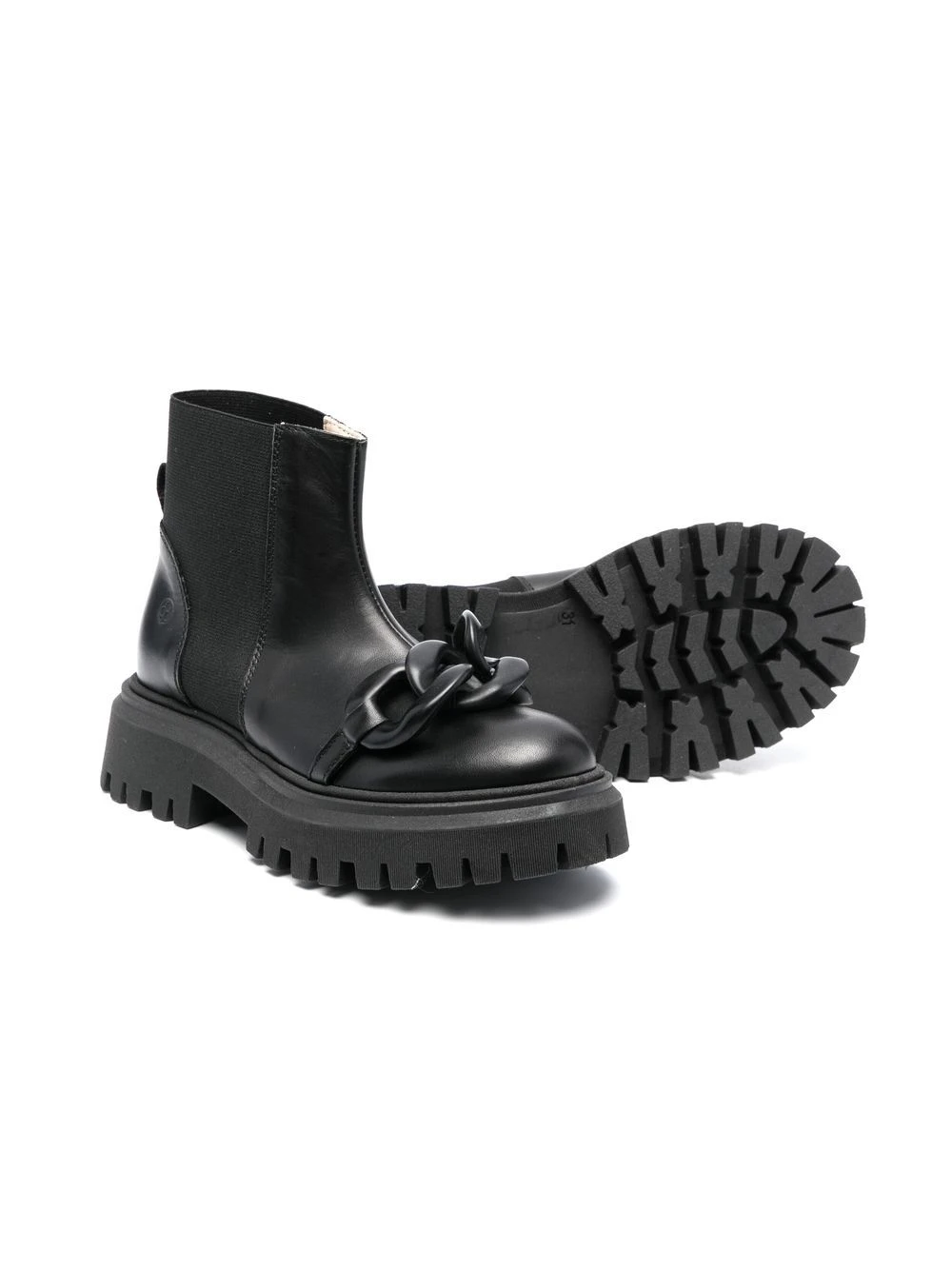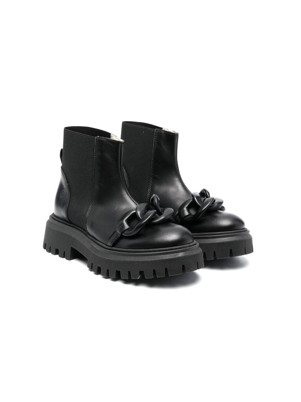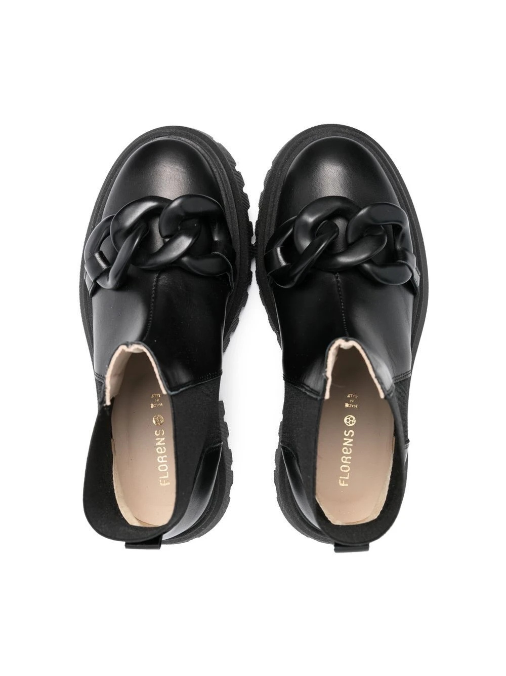 Sort, kalveskind, kædedetalje, rund tå, elastiske sidepaneler, lav blokhæl.