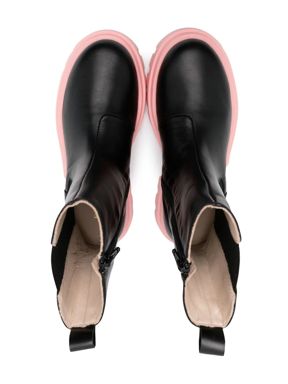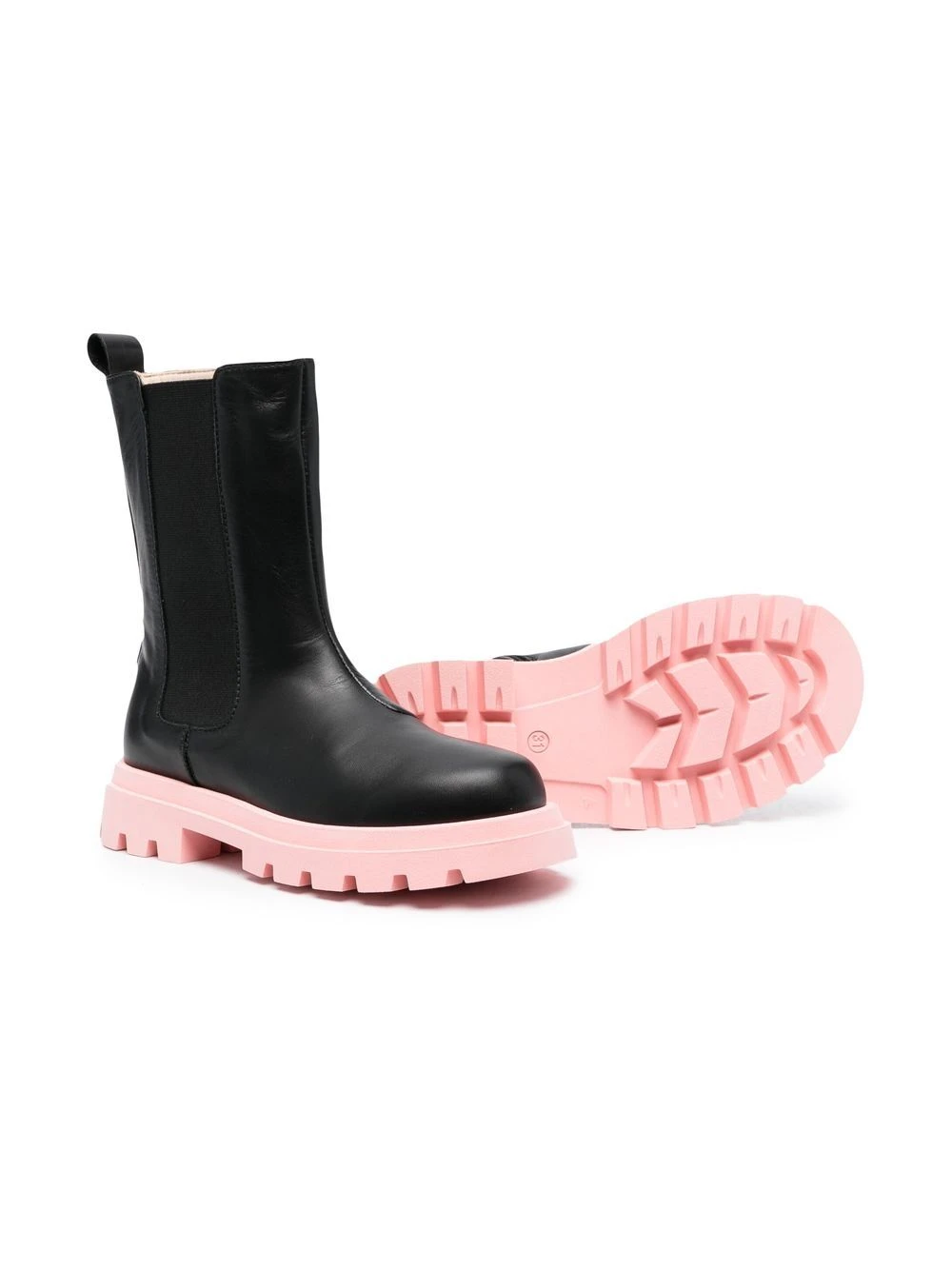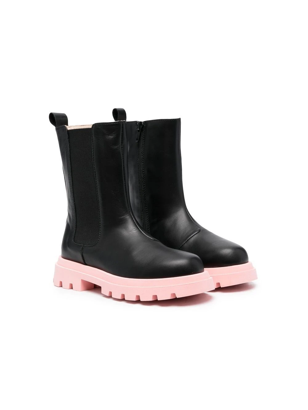 Sort, pink, læder, ankellængde, pull on-design, tofarvet design, rund tå, elastiske sidepaneler, lynlåslukning i siden, hæltræk, rillet gummisål.