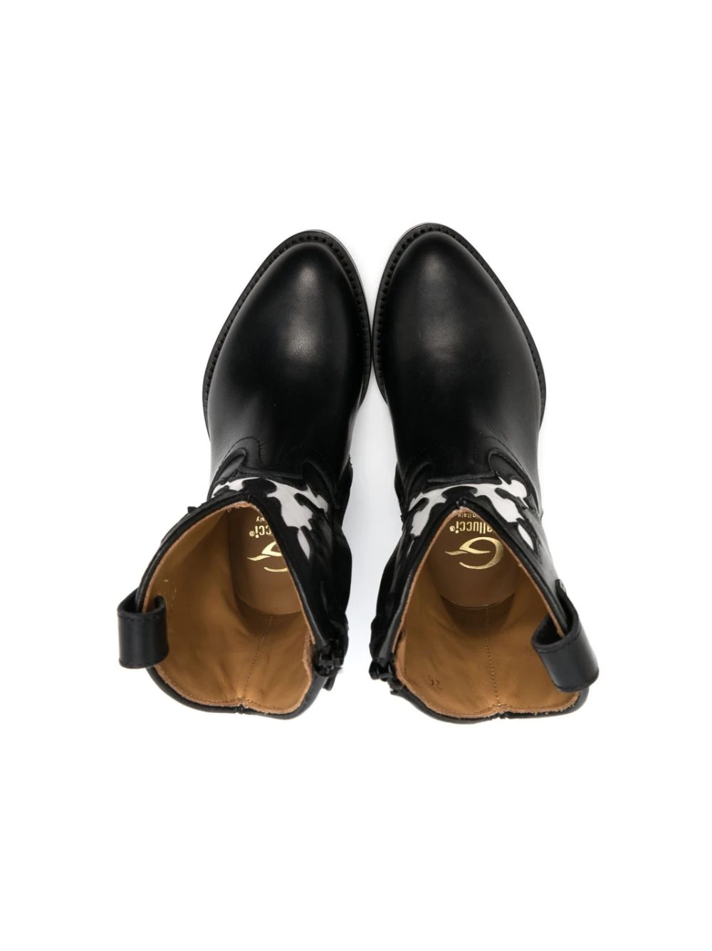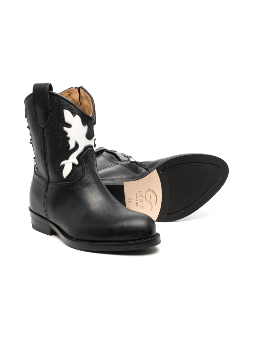 Sort/hvid, kalveskind, broderet design, panel i Western-stil, mandelformet tå, dobbelt rem ved åbningen, længde til midt på læggen, slip-on-design.