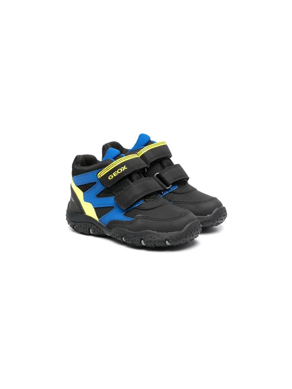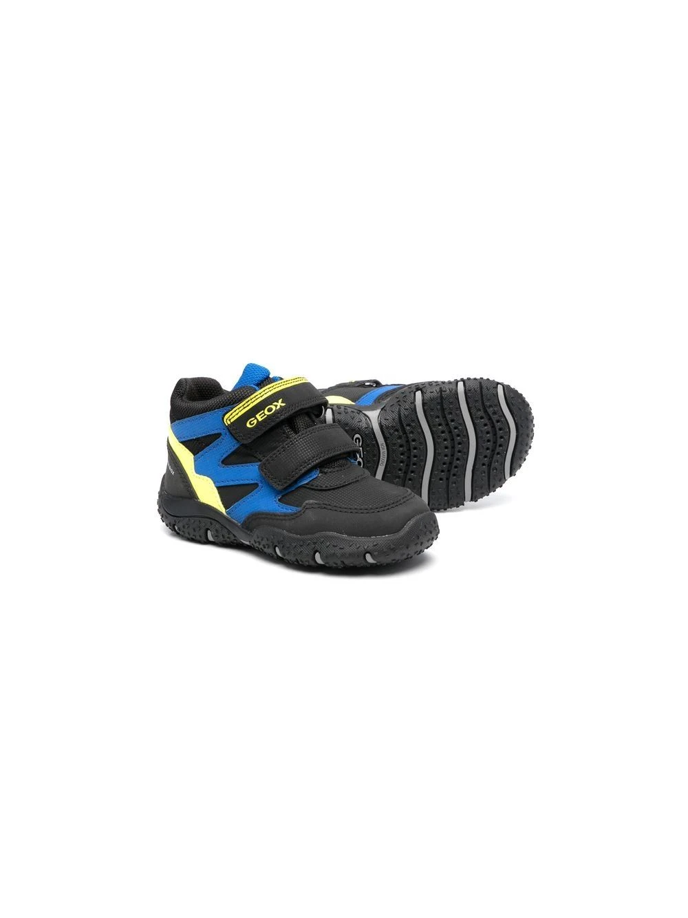 Sort, limegrøn, logotryk foran, indersål med logo, rund tå, burrelukning foran, flad gummisål.