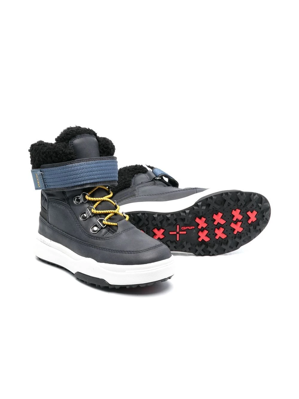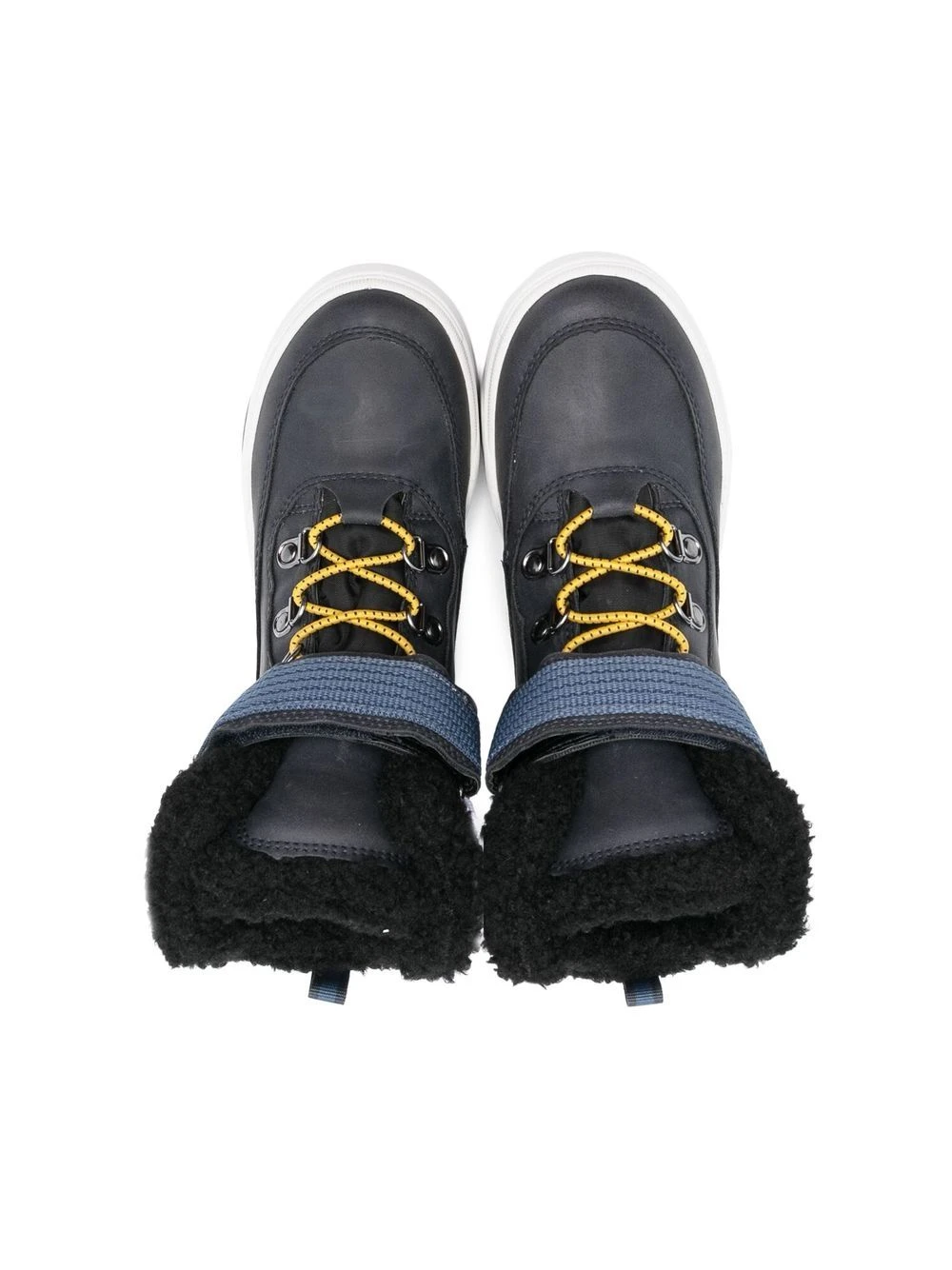 Marineblå, sort, imiteret læder, rem med logotryk, burrelukning over snørelukning foran, fleece-for, rund tå, flad gummisål, ankellængde.