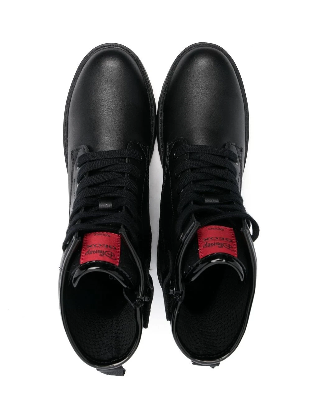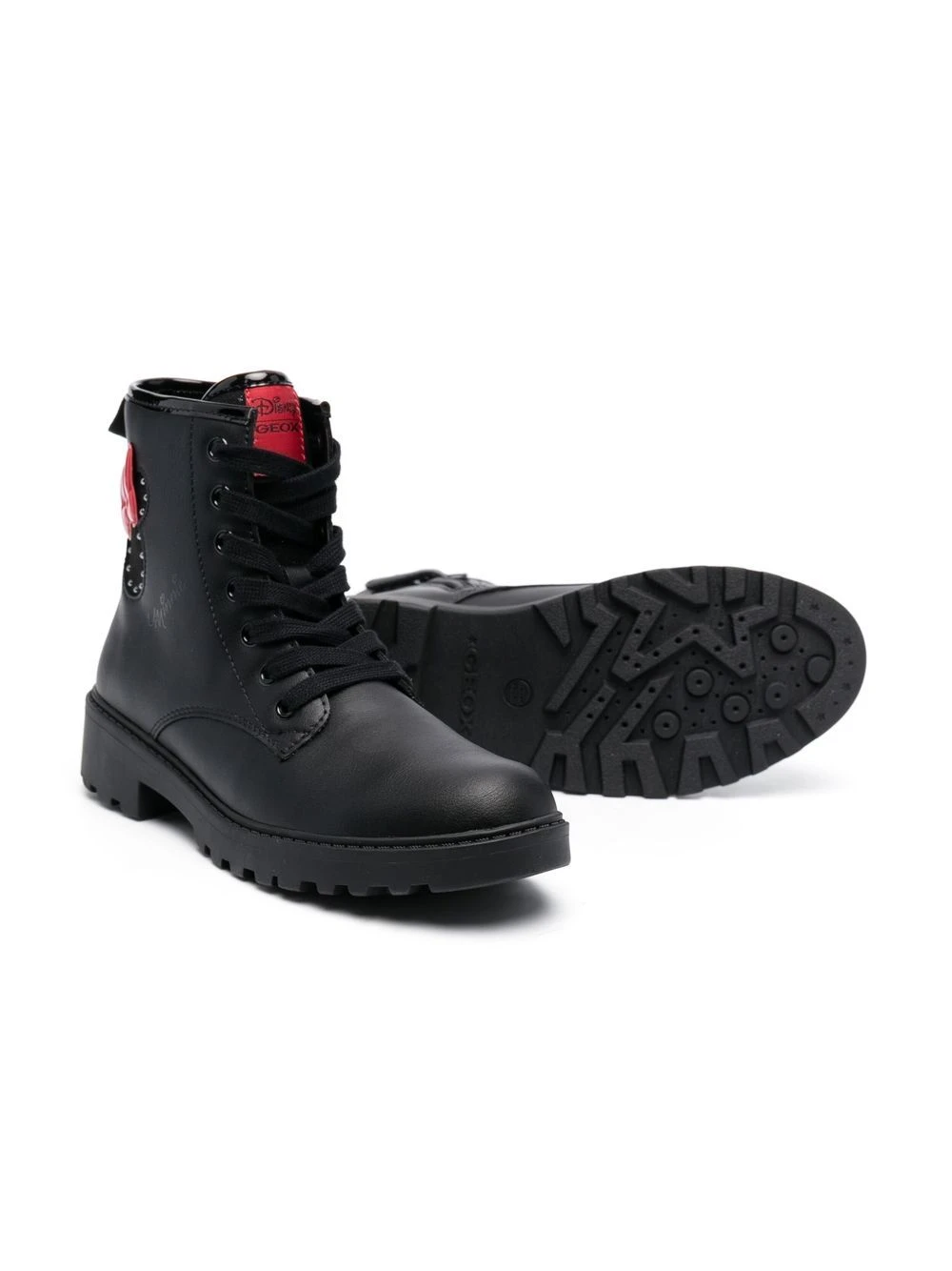 Sort/rød, imiteret læder, logomærke på pløsen, snørelukning foran, rillet gummisål.