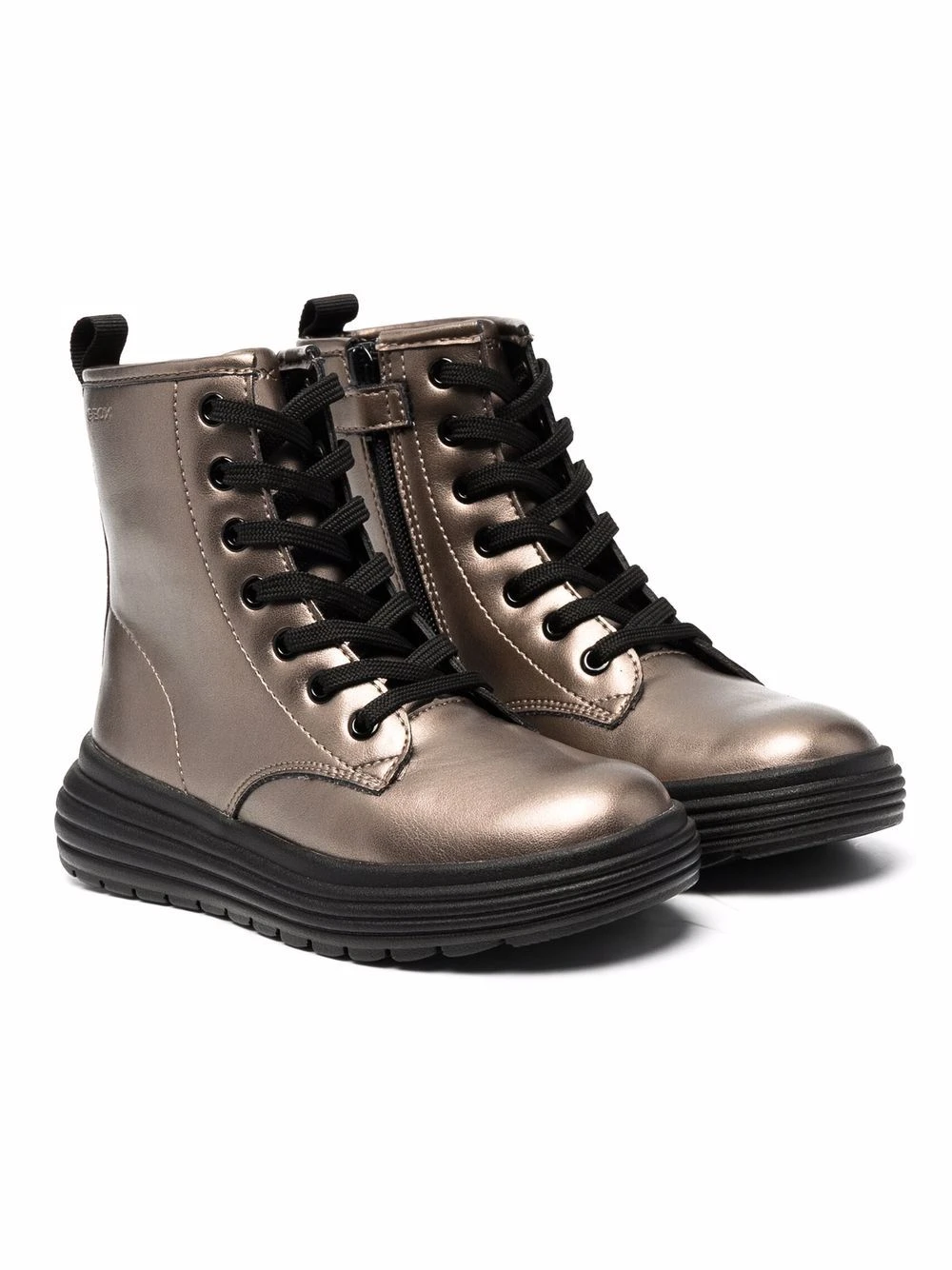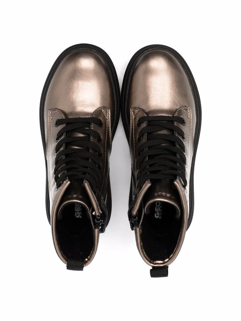 Metallisk effekt, rund tå, snørelukning foran, hæltræk, flad gummisål.