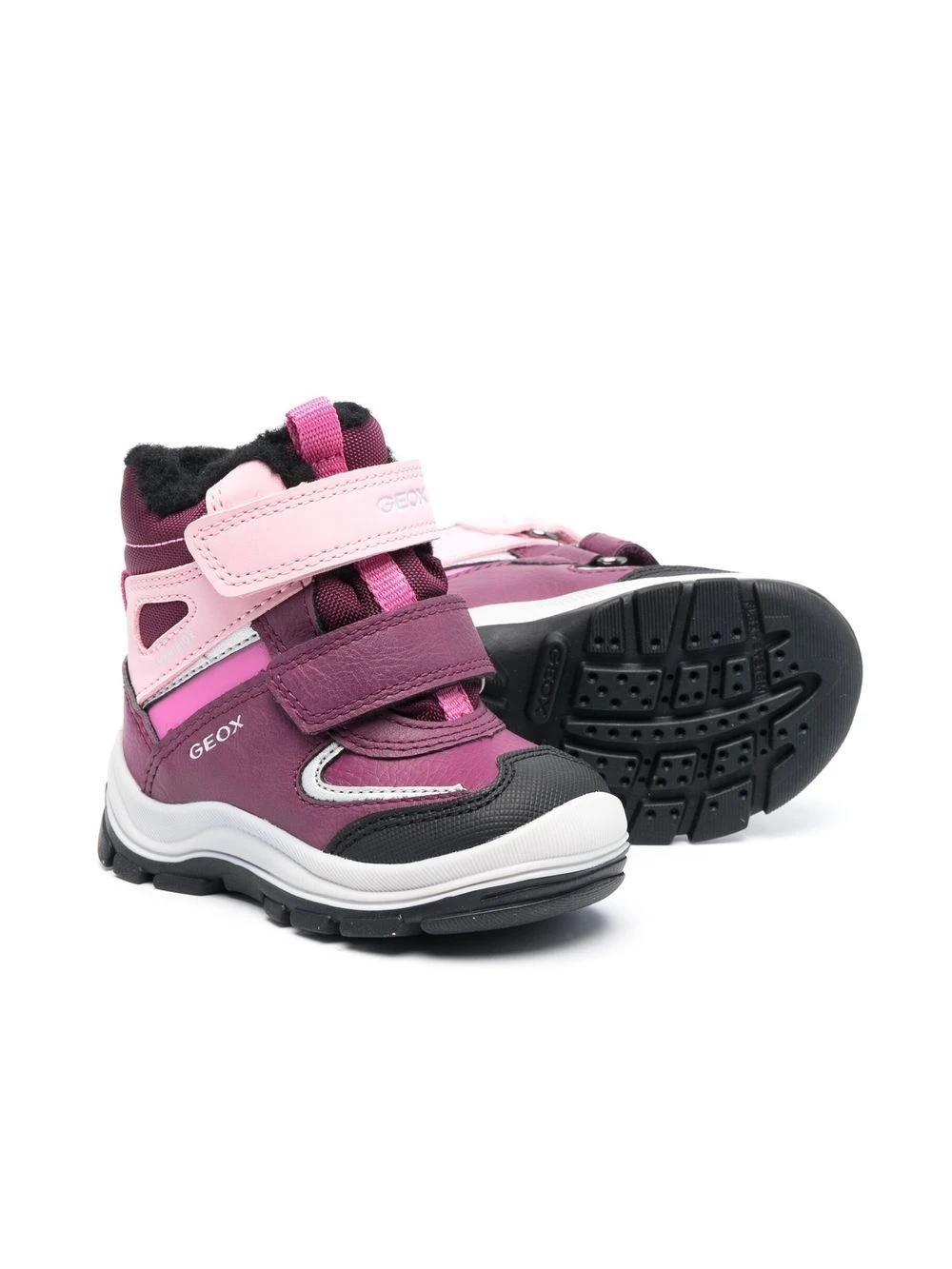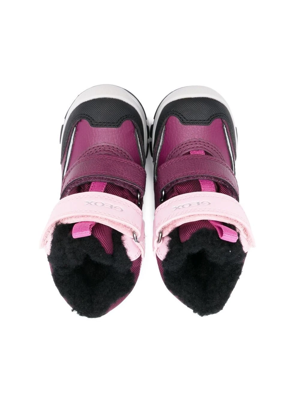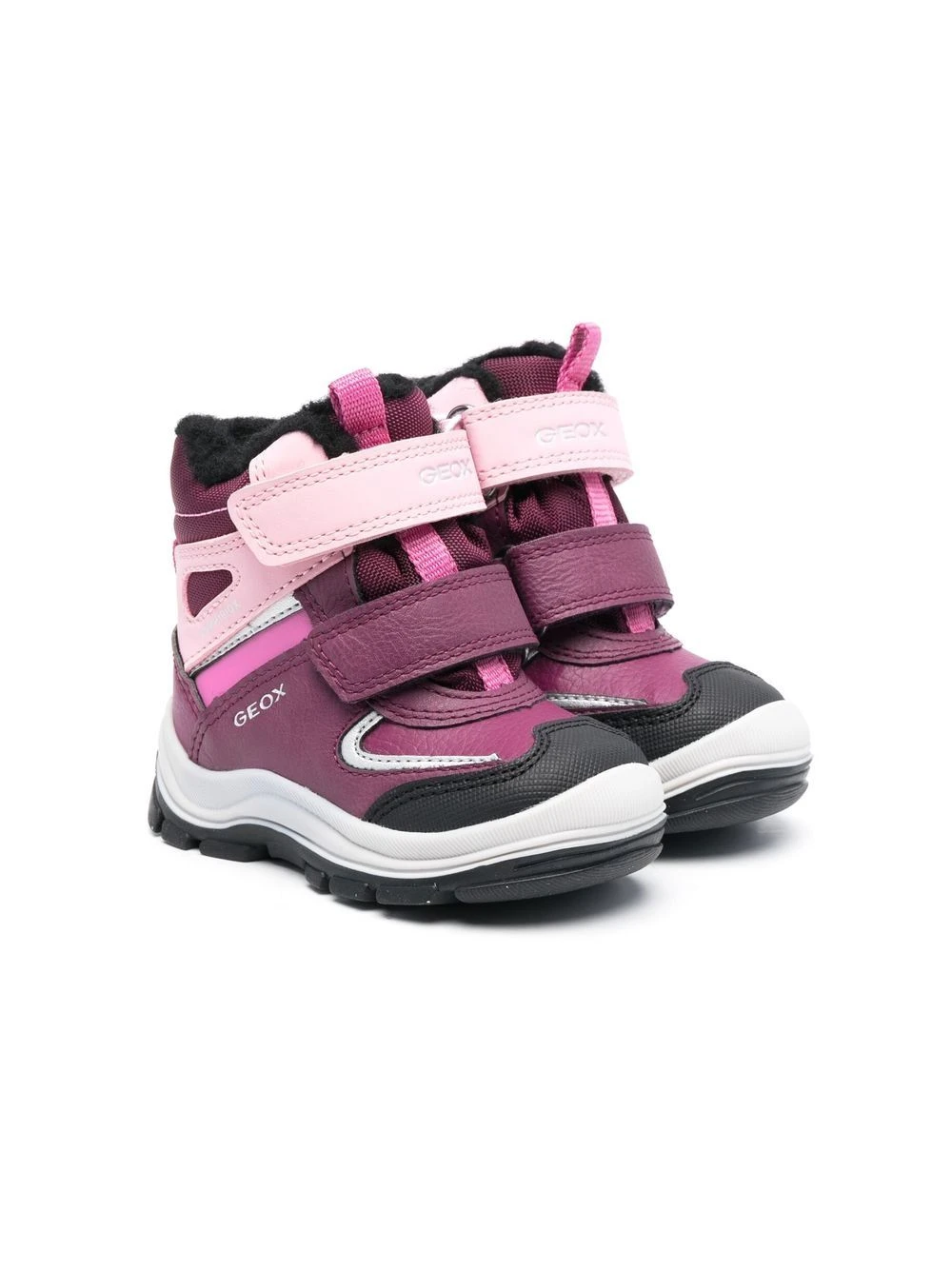 Bordeaux, lyserød, logotryk i siden, burrelukning foran, rund tå, flad sål.