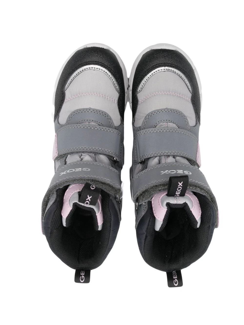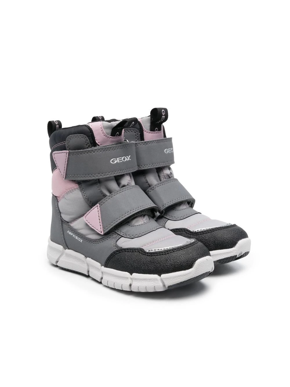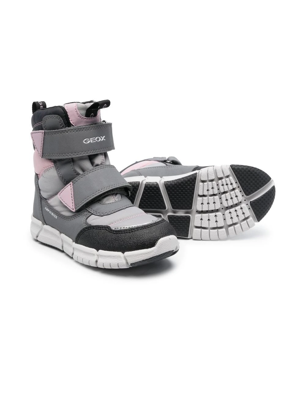 Grå, logotryk foran, rund tå, flad sål, burrelukning foran.