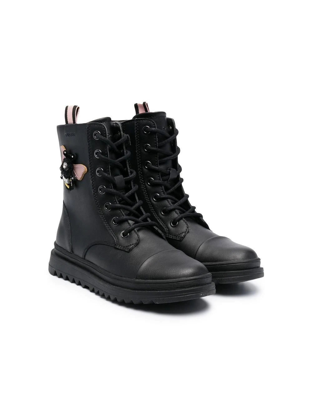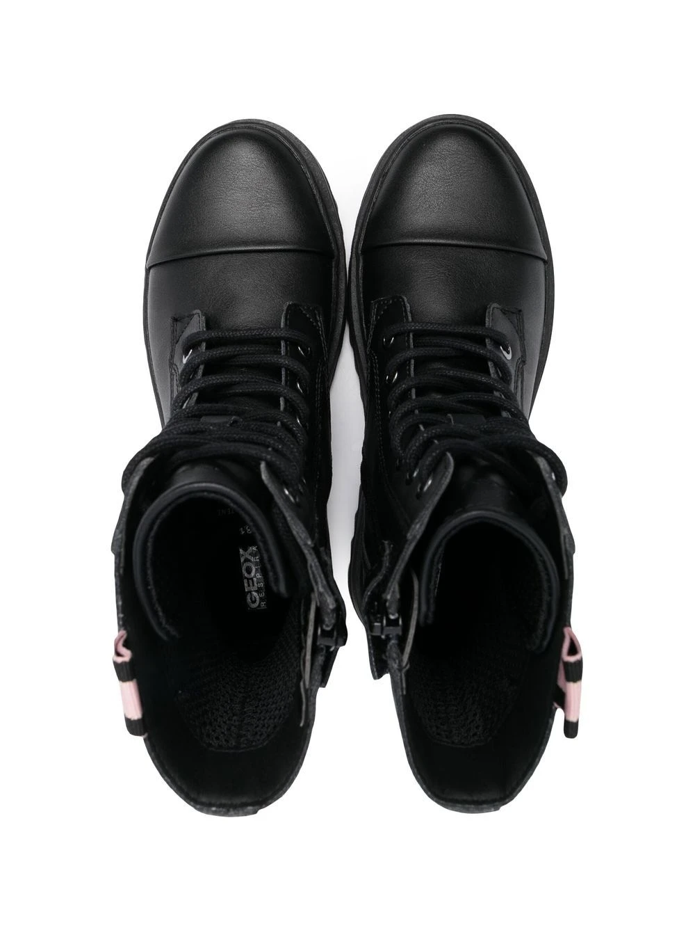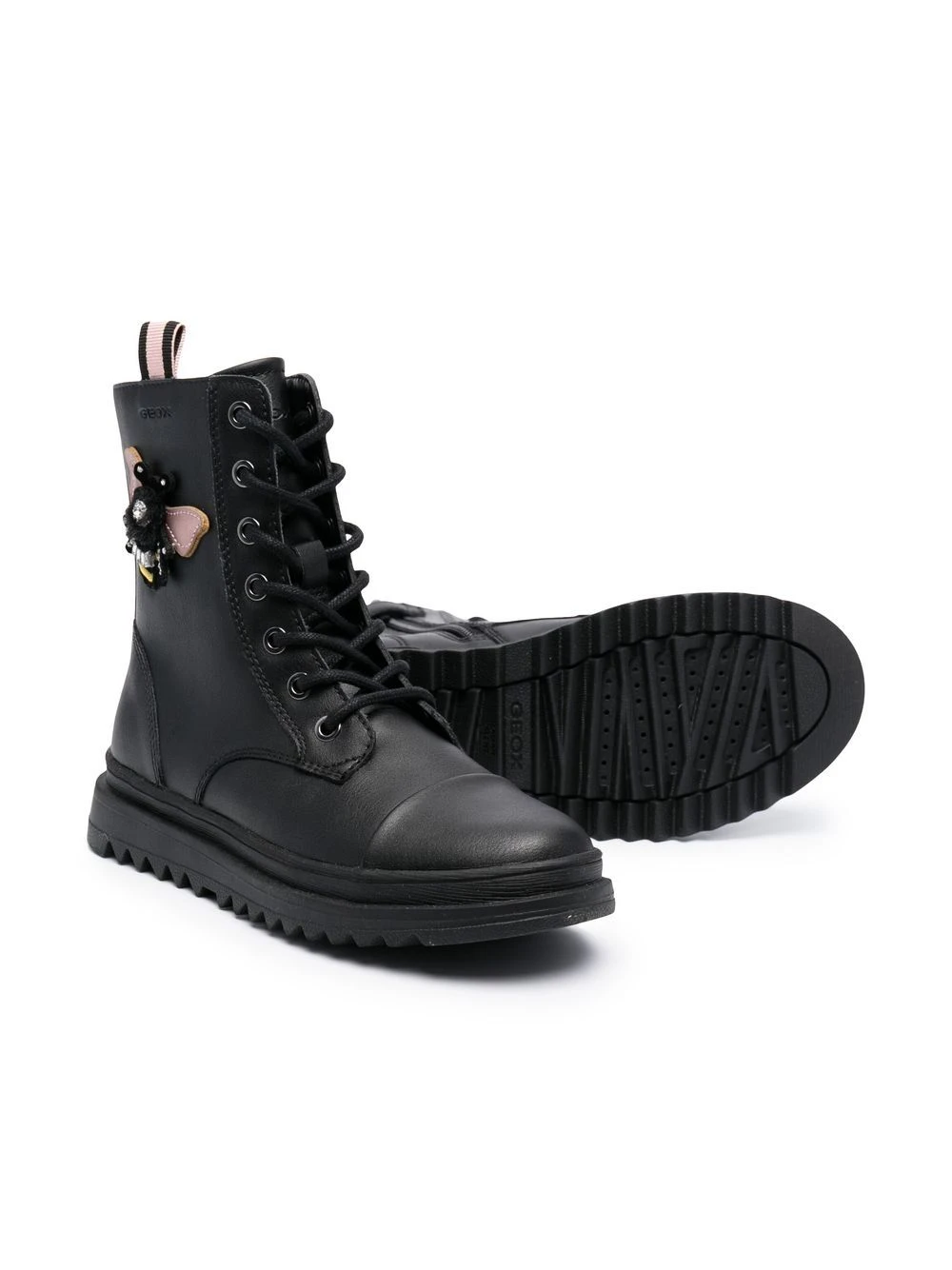 Sort, imiteret læder, applikeret detalje, præget logo i siden, præget logo på pløsen, ankellængde, rund tå, snørelukning foran, lynlåslukning i siden, hæltræk.