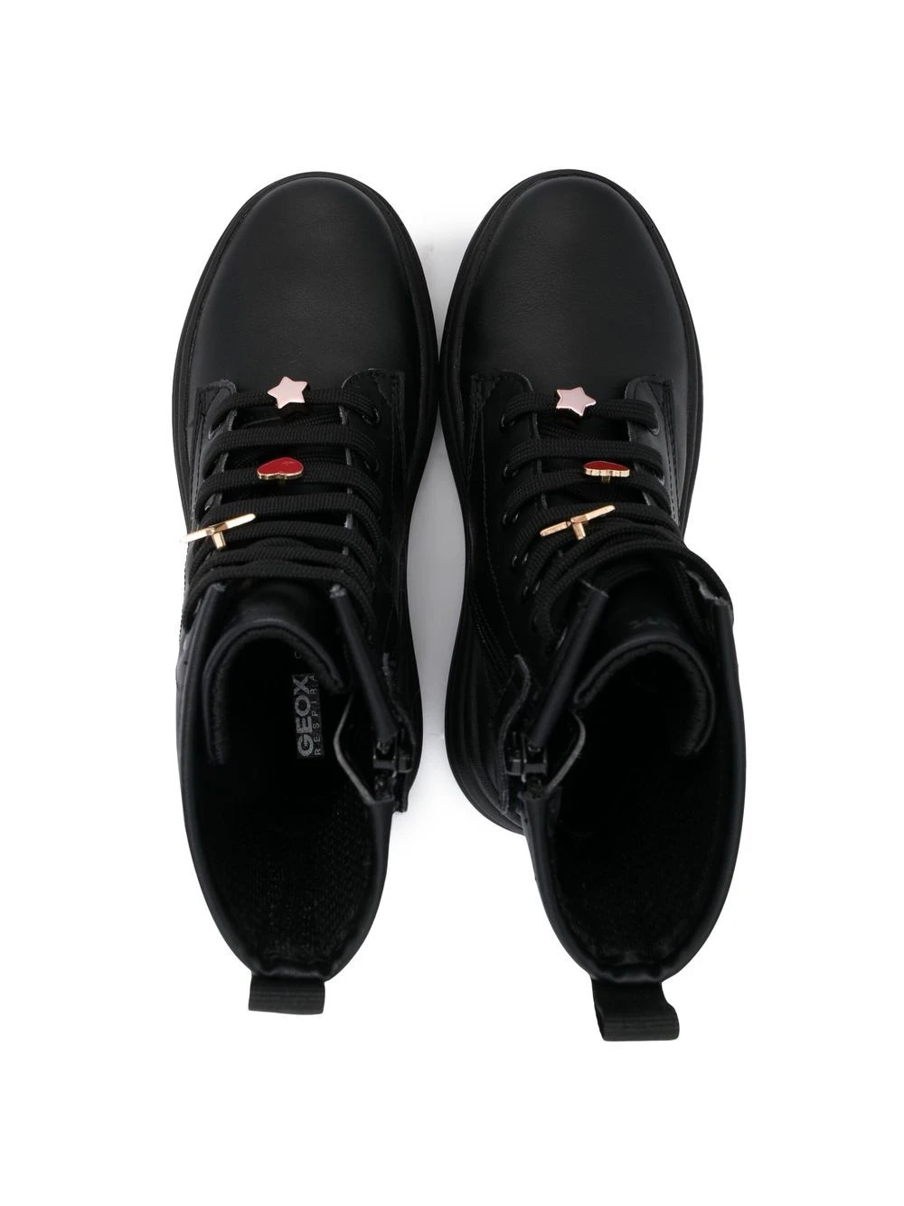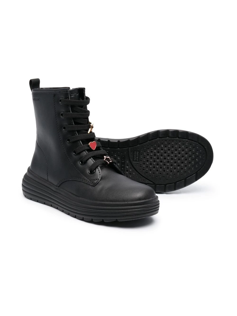 Sort, hjerteformet vedhæng, vedhængdetalje, snørelukning foran, hæltræk, kraftig gummisål.