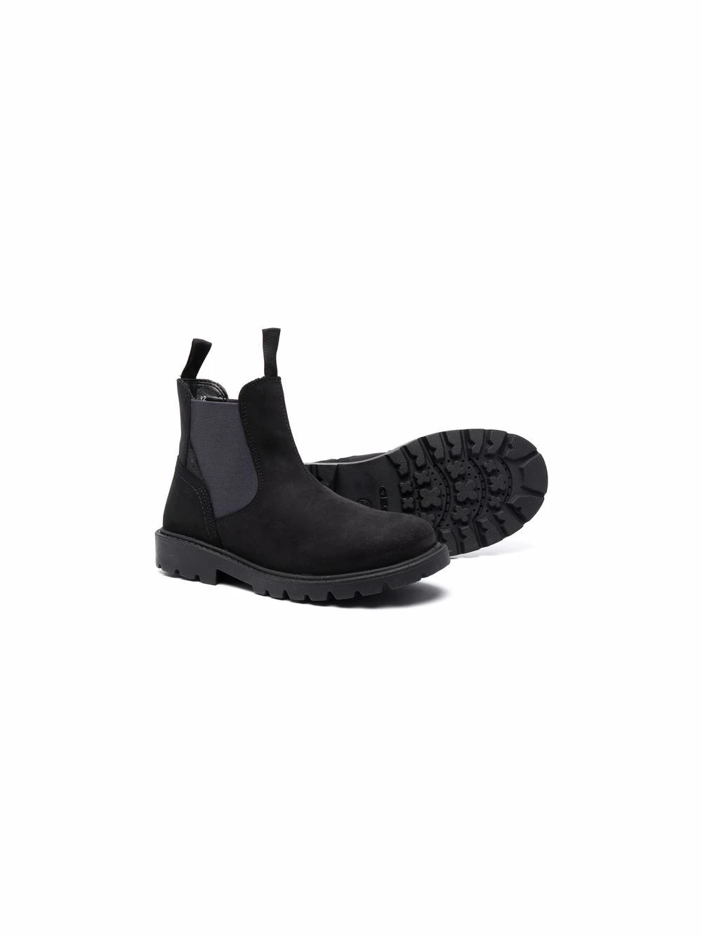 Ankellængde, dobbelt rem ved åbningen, elastiske sidepaneler, rund tå, flad gummisål. Materiale: læder.