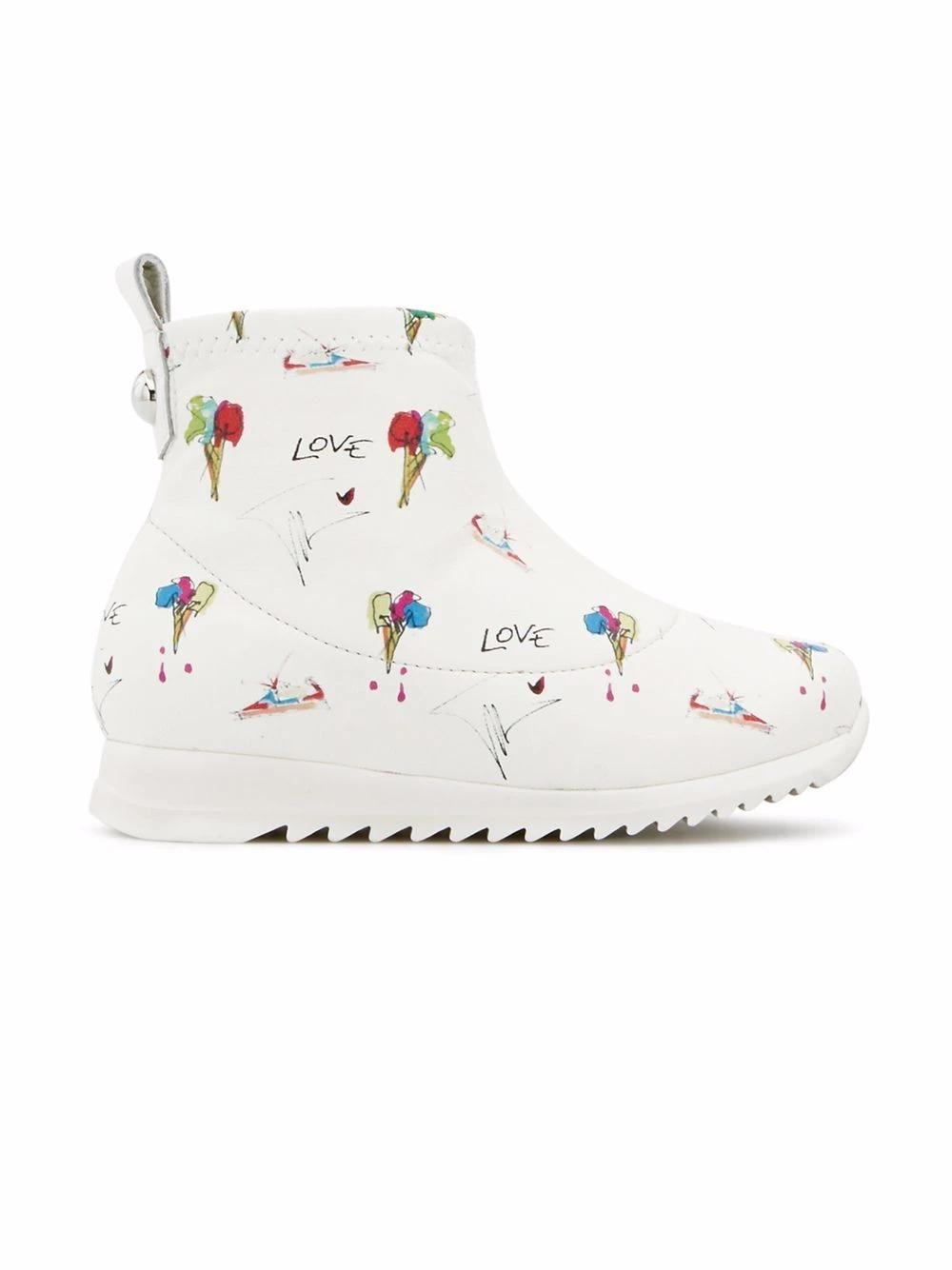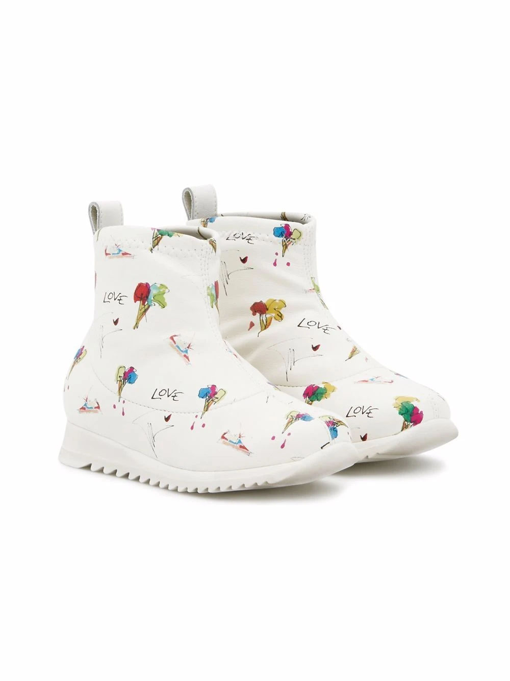 Grafisk tryk, rund tå, pull on-design, ankellængde, hæltræk, rillet gummisål.