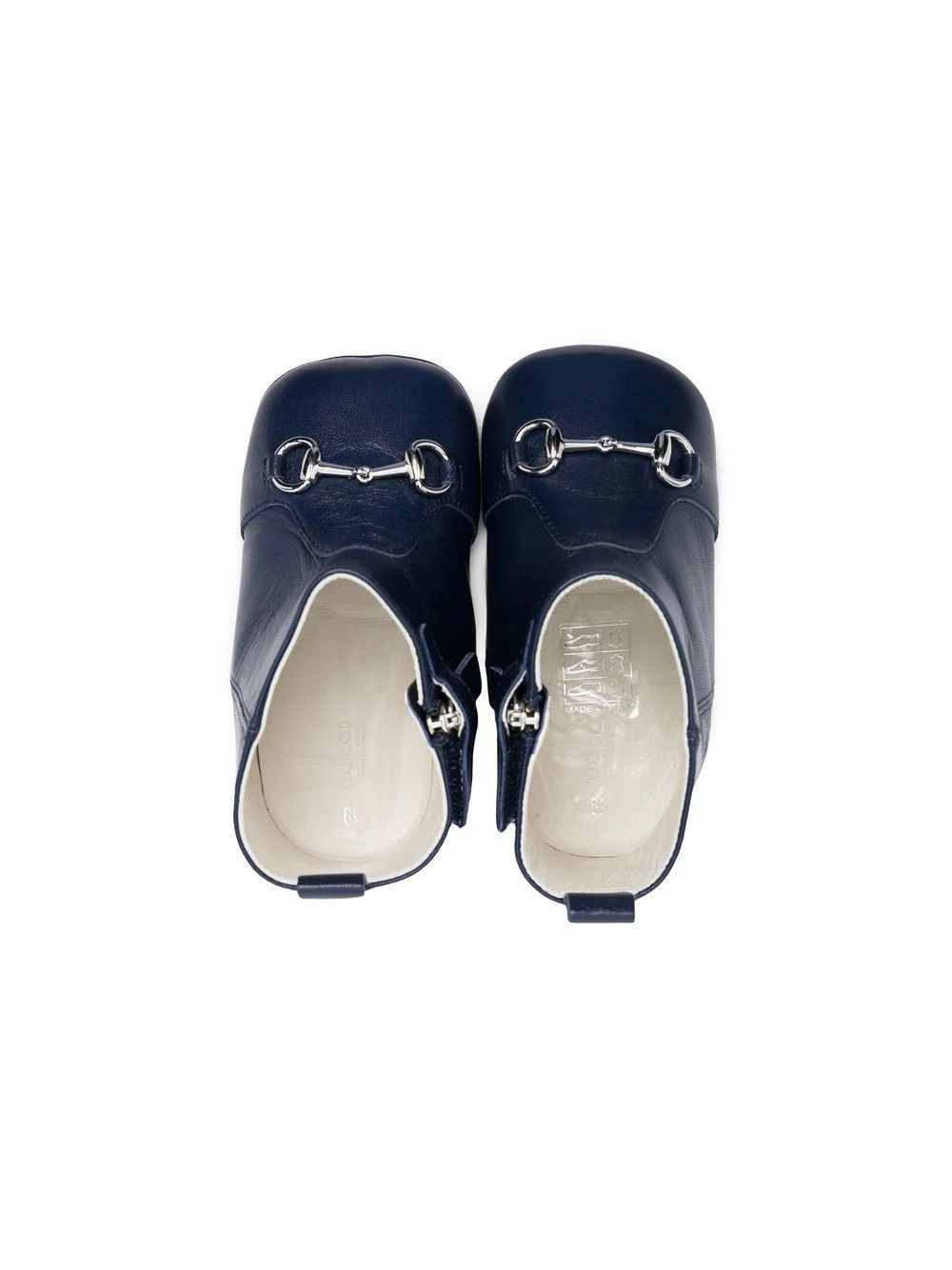 Blå, kalveskind, Horsebit-detalje, rund tå, hæltræk, lynlåslukning i siden.