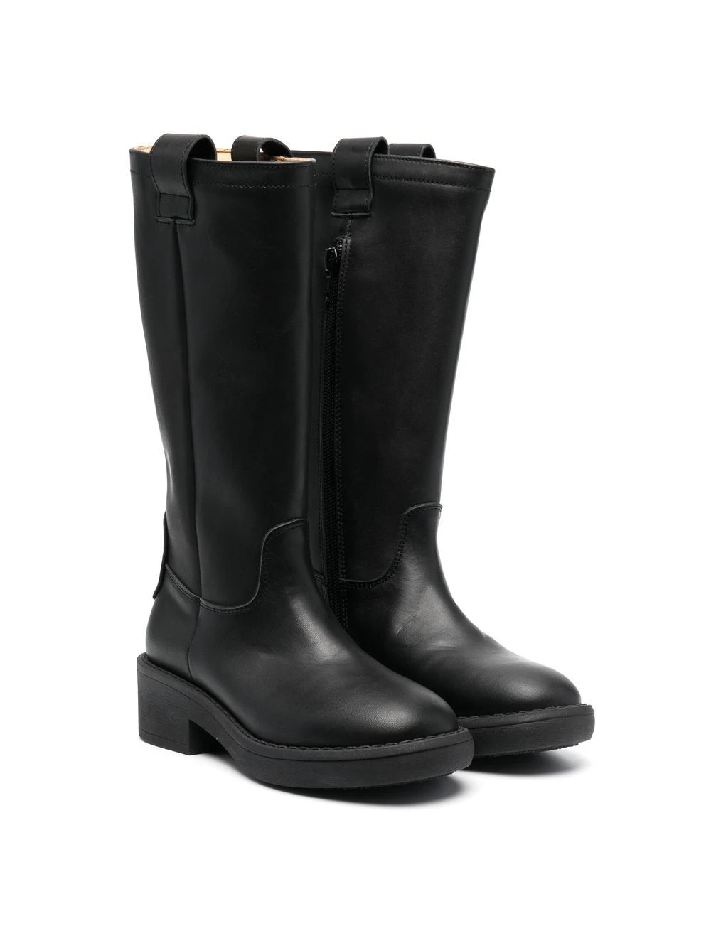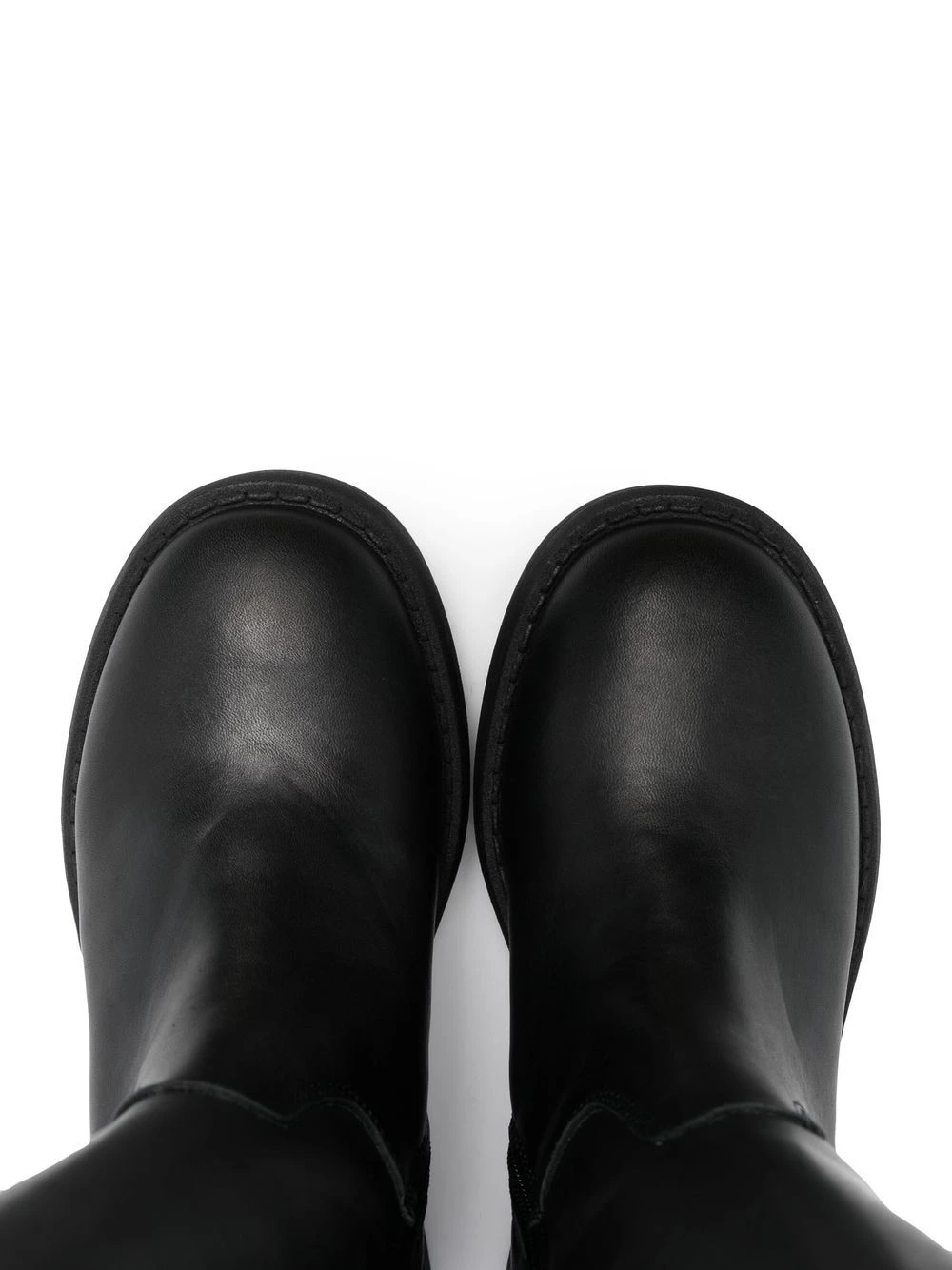 Kulsort, læder, rund tå, knælængde, dobbelt rem ved åbningen, kraftig gummisål.