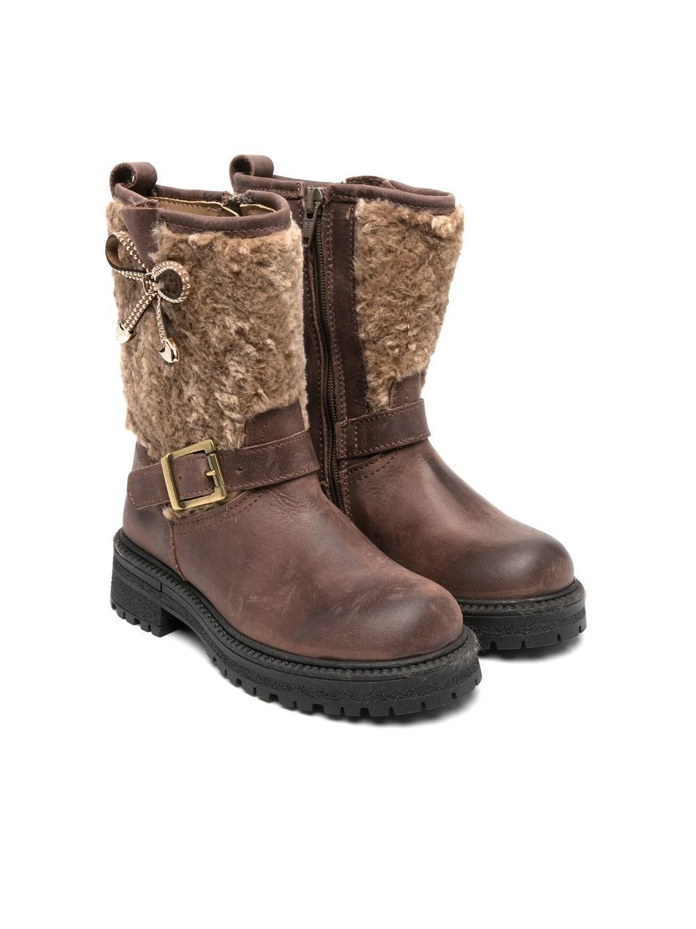 Kaffebrun, kalveskind, detalje i imiteret pels, sløjfedetalje, dekorativ spænde-detalje, lynlåslukning i siden, hæltræk, rund tå, indersål i læder med logo, flad gummisål.