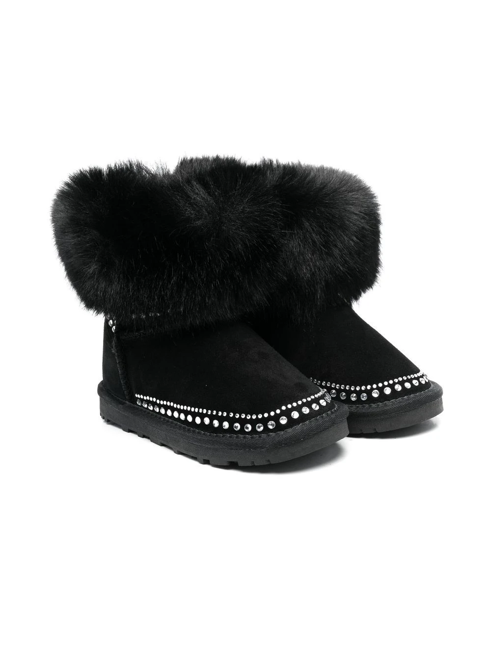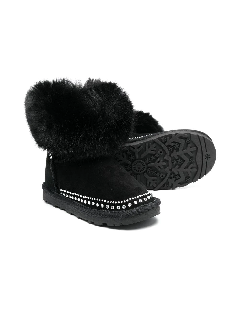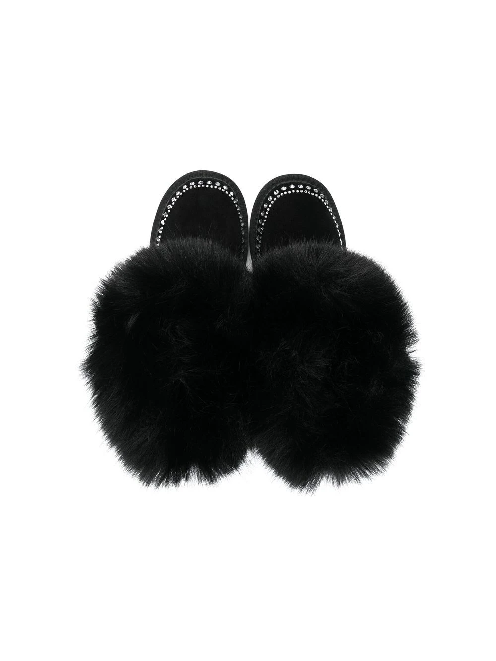 Imiteret pelsdetalje, krystaludsmykning, rund tå, indersål med logo, flad sål.