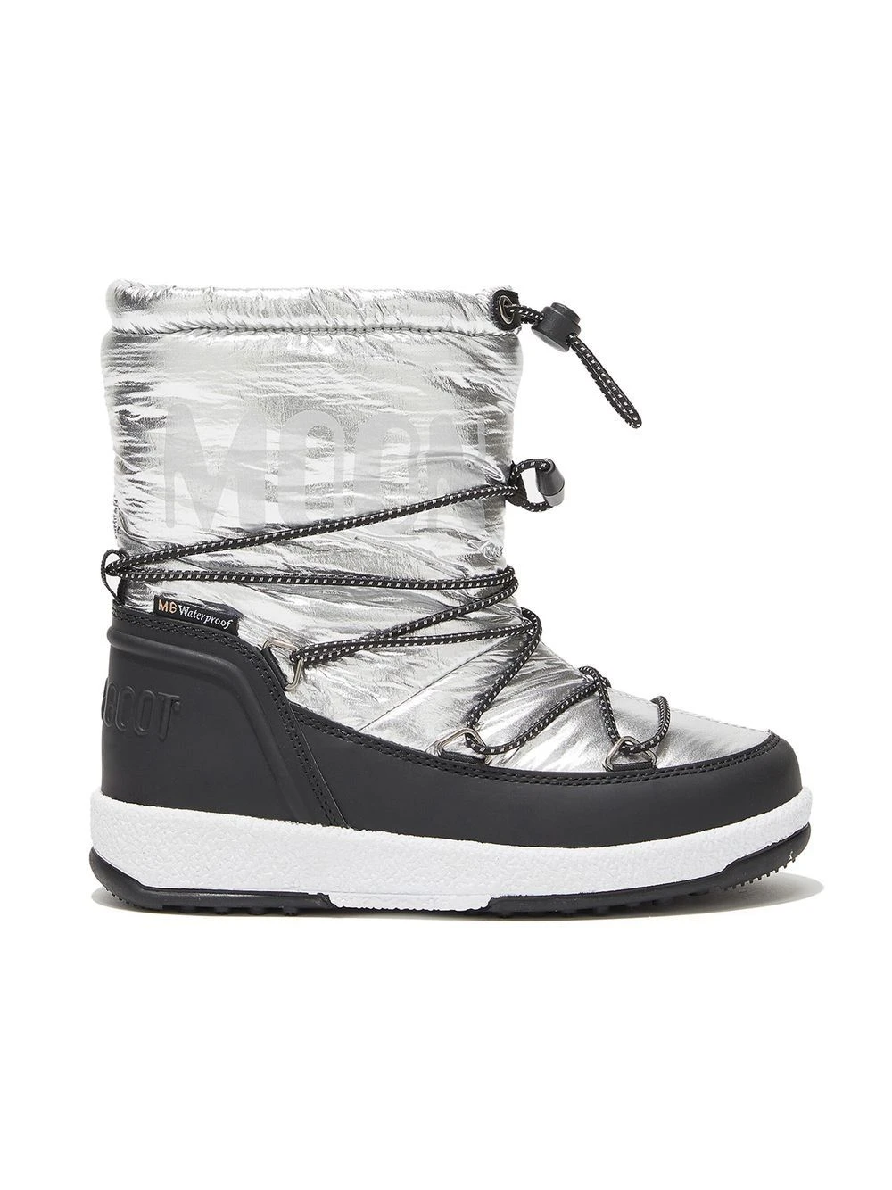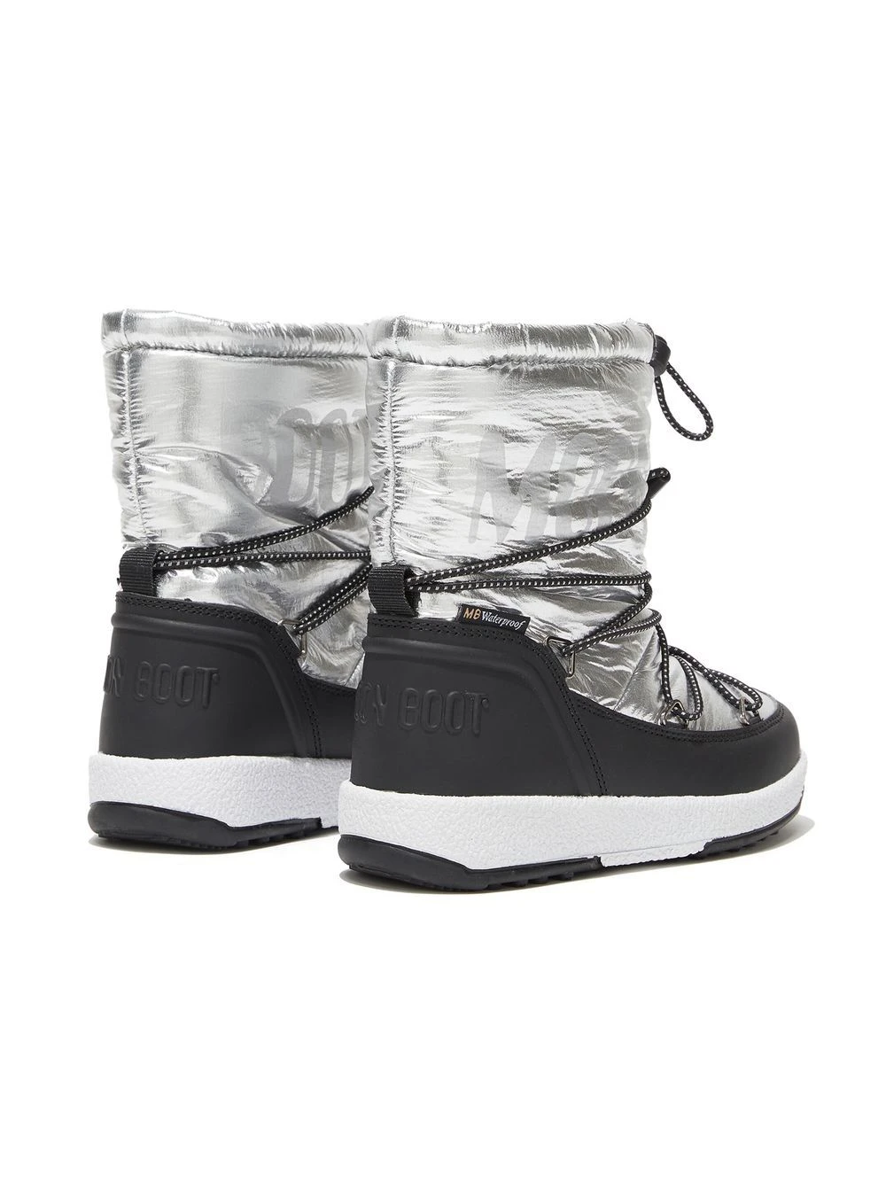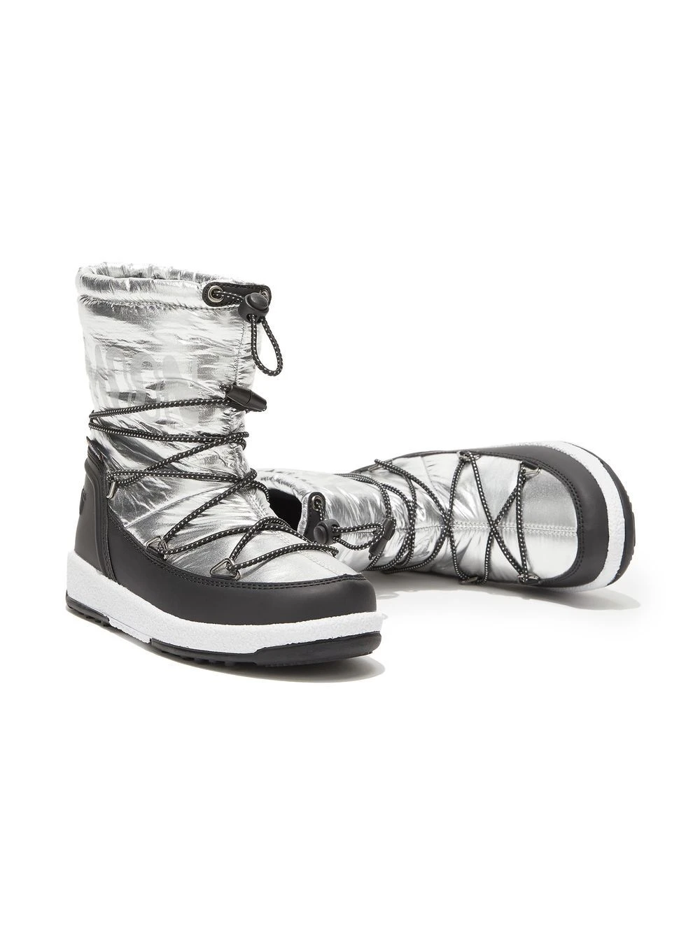 Sort, sølv, præget logo bagpå, snørelukning foran, lukning med løbesnor, rund tå, kraftig gummisål.