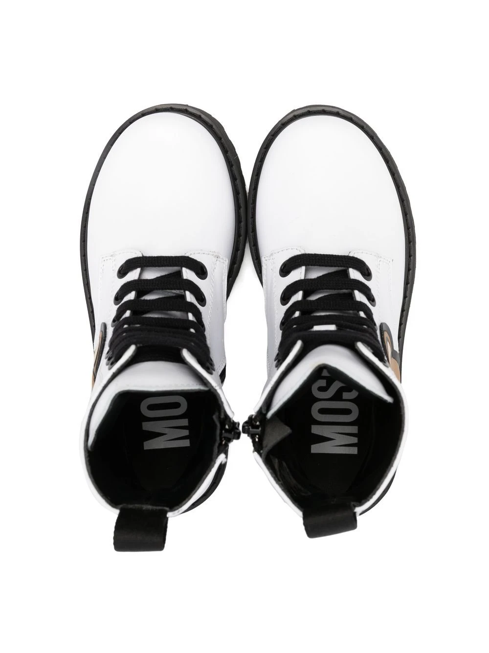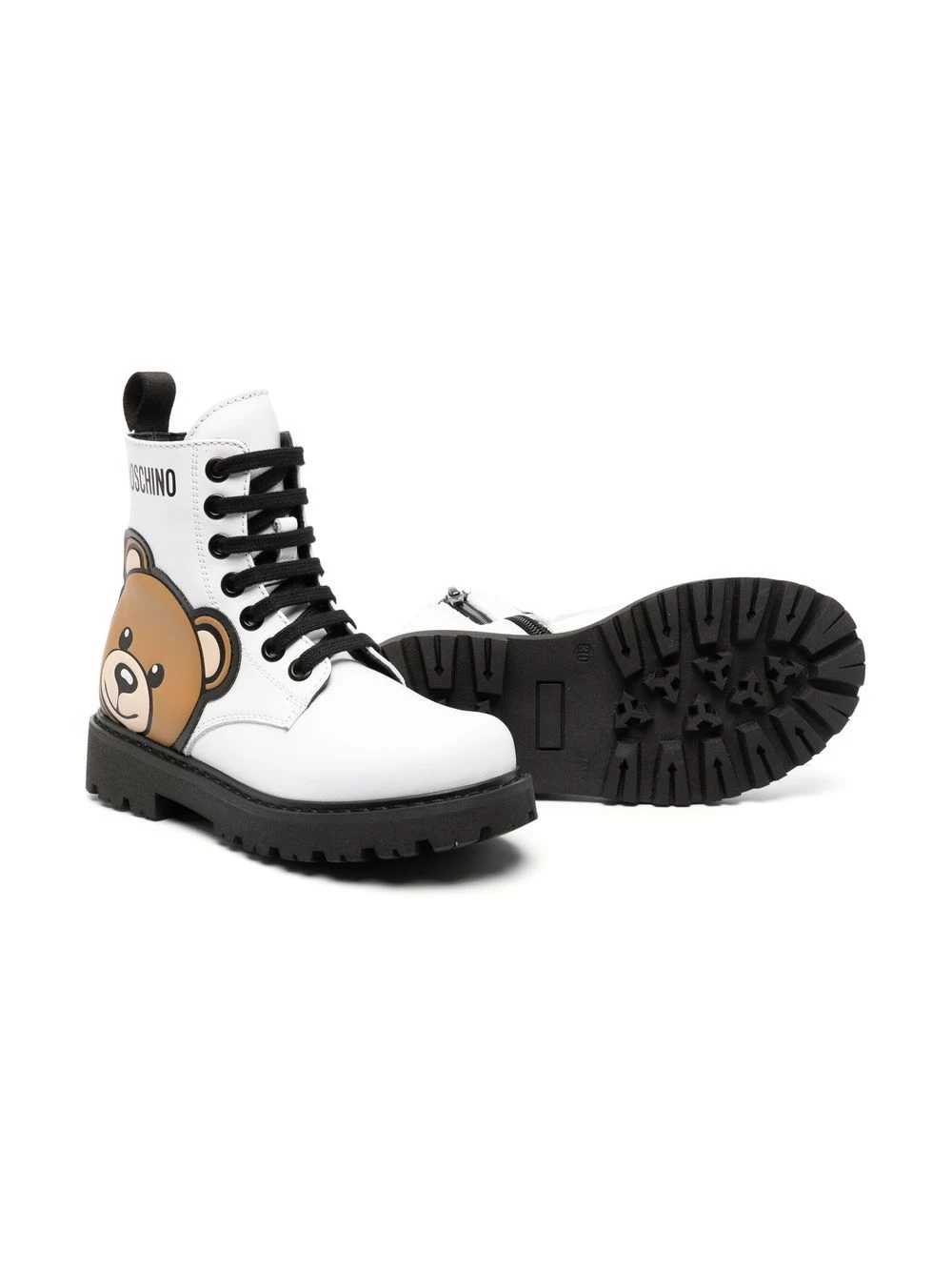 Kalveskind, Teddy Bear-motiv, logoapplikation, logotryk i siden, rund tå, snørelukning foran, hæltræk, foring, lav hæl, rillet gummisål.