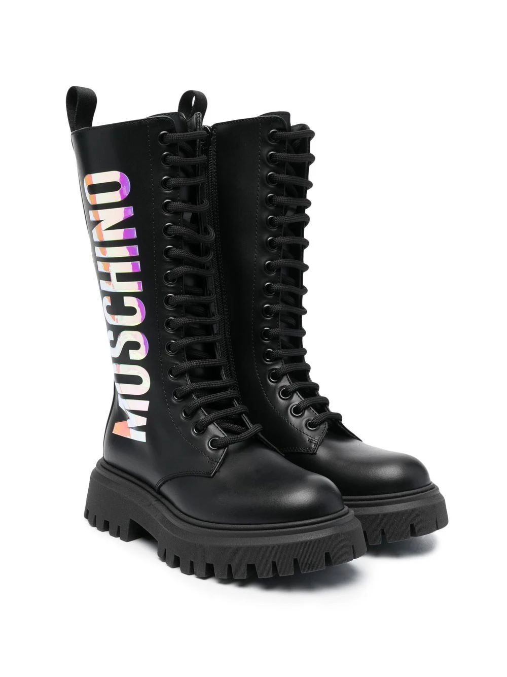 Sort, kalveskind, holografisk logotryk, rund tå, snørelukning foran, læderfor, lynlåslukning i siden, hæltræk, rillet gummisål.