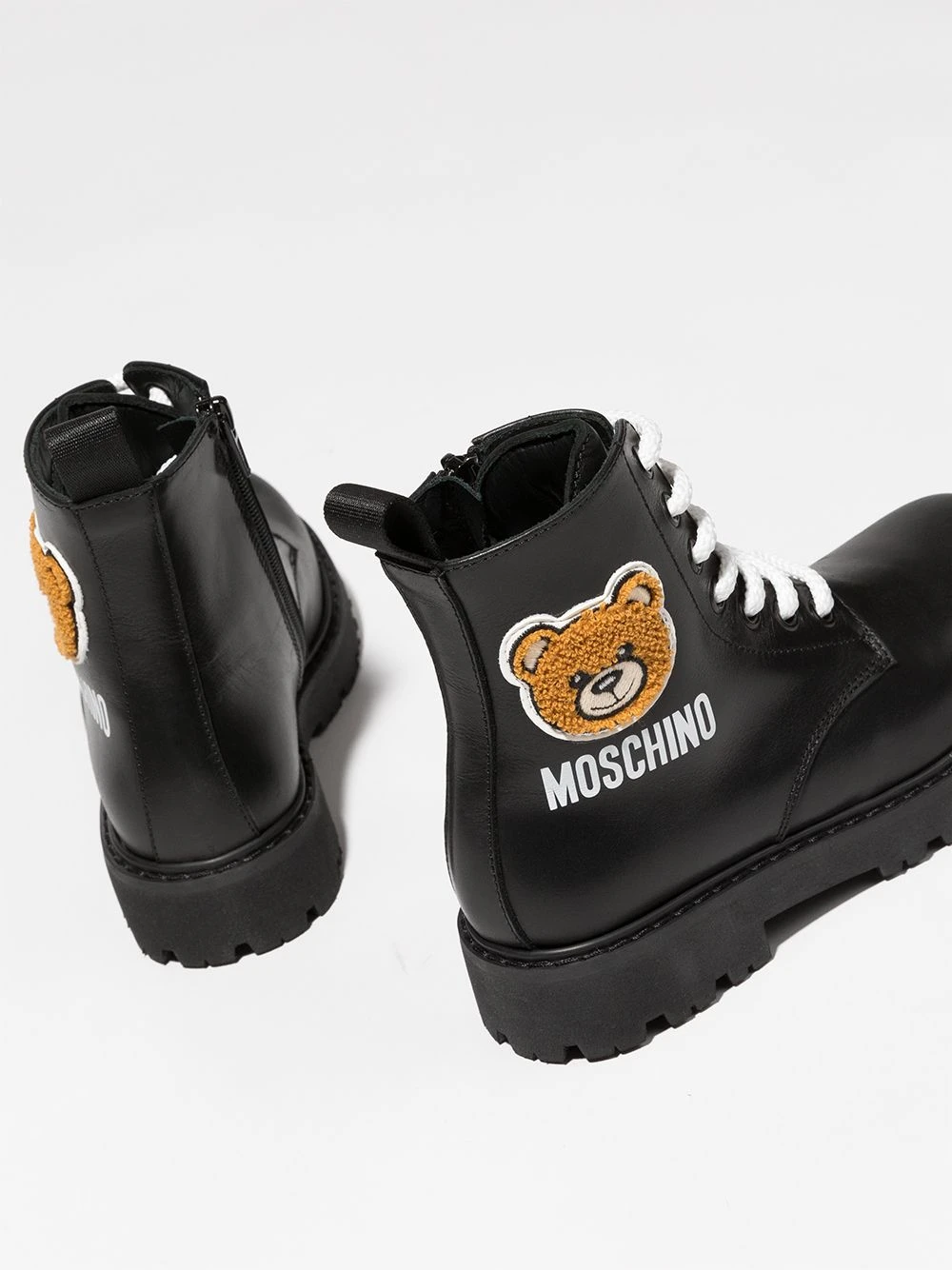 Teddy Bear-motiv, imiteret snøredesign, kort lynlåslukning i siden, rund tå, hæltræk, rillet gummisål. Materiale: læder.