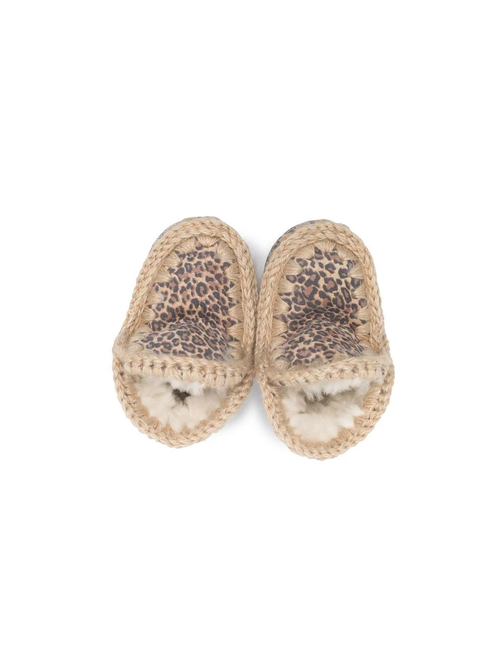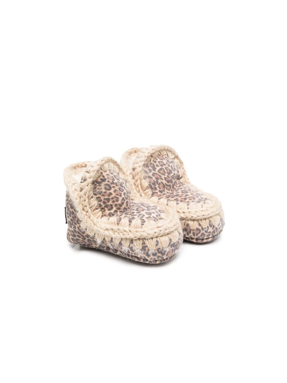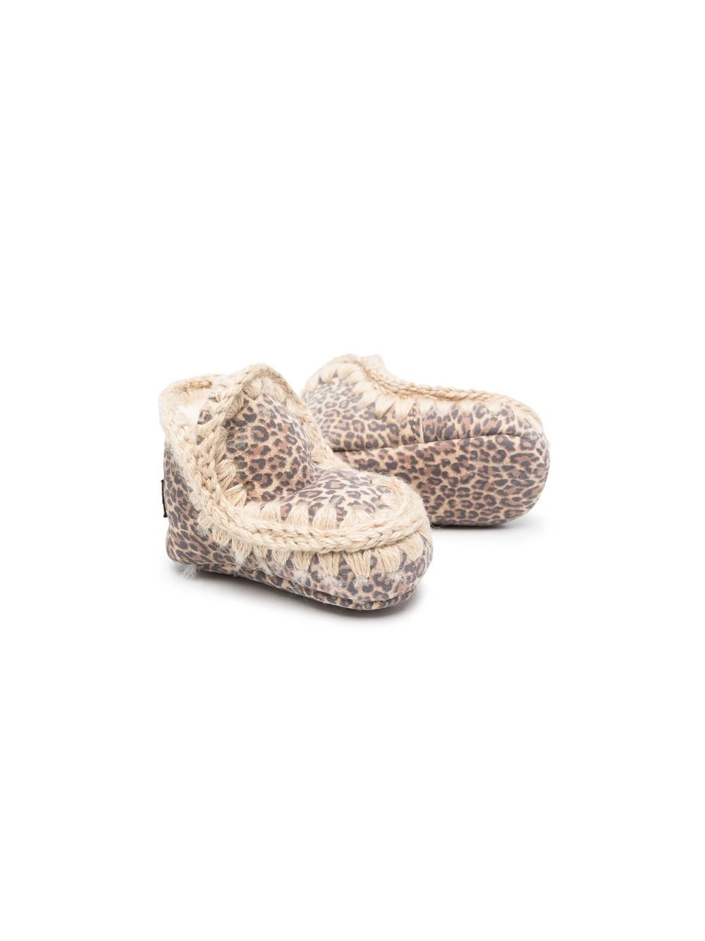 Beige, brun, sort, kalveruskind, leopardprint, logomærke bagpå, kontraststing, lammeskindsfor, flad lædersål, ankellængde.