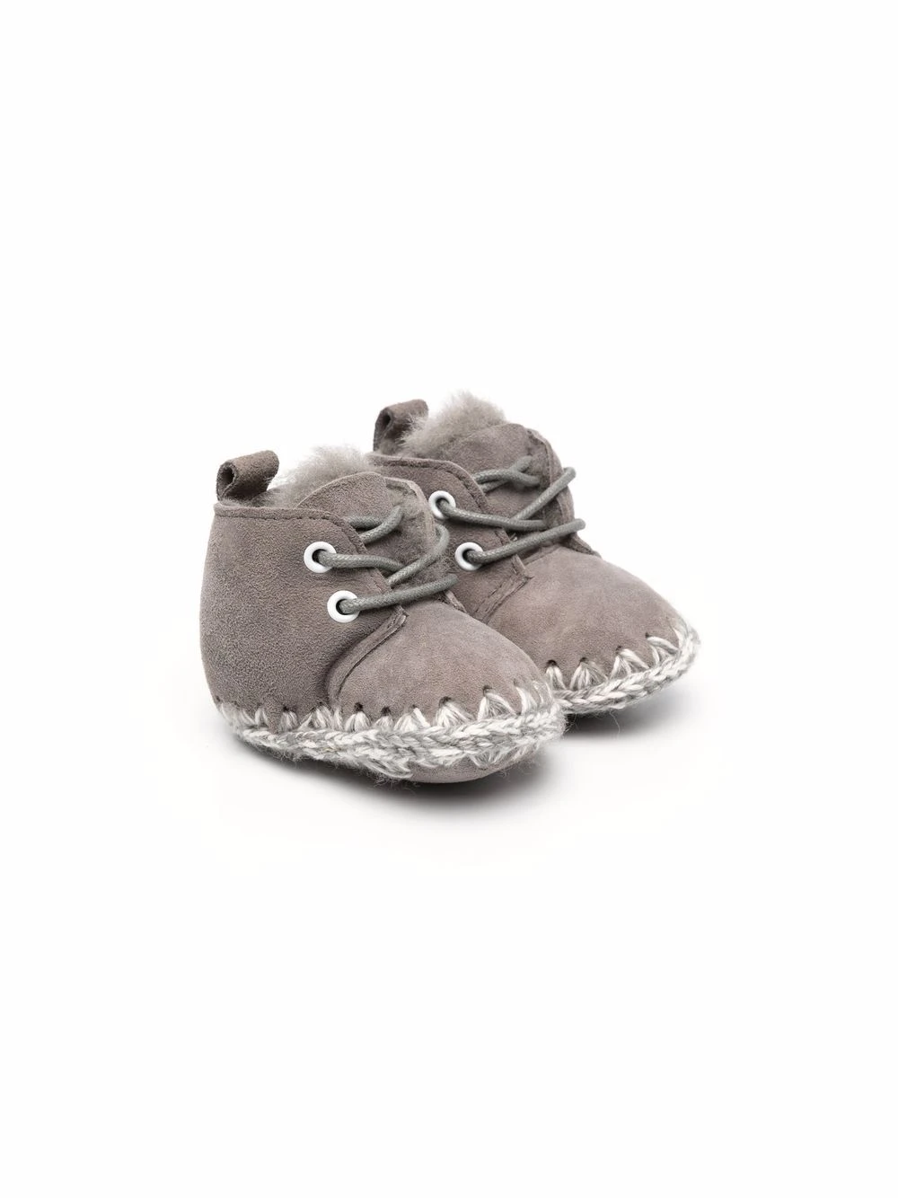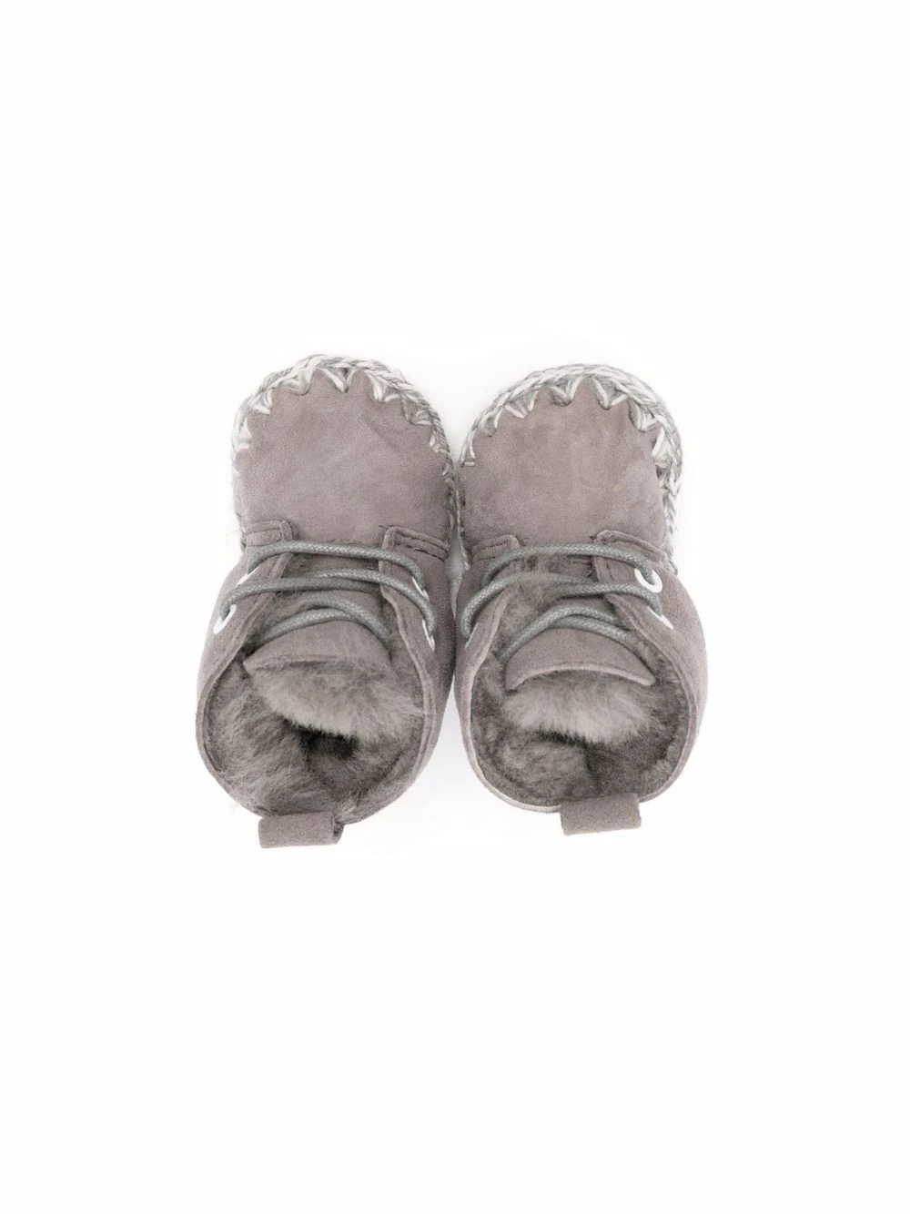 Kant med syningsdetaljer, lammeskindsfor, rund tå, snørelukning foran, hæltræk, ankellængde.
