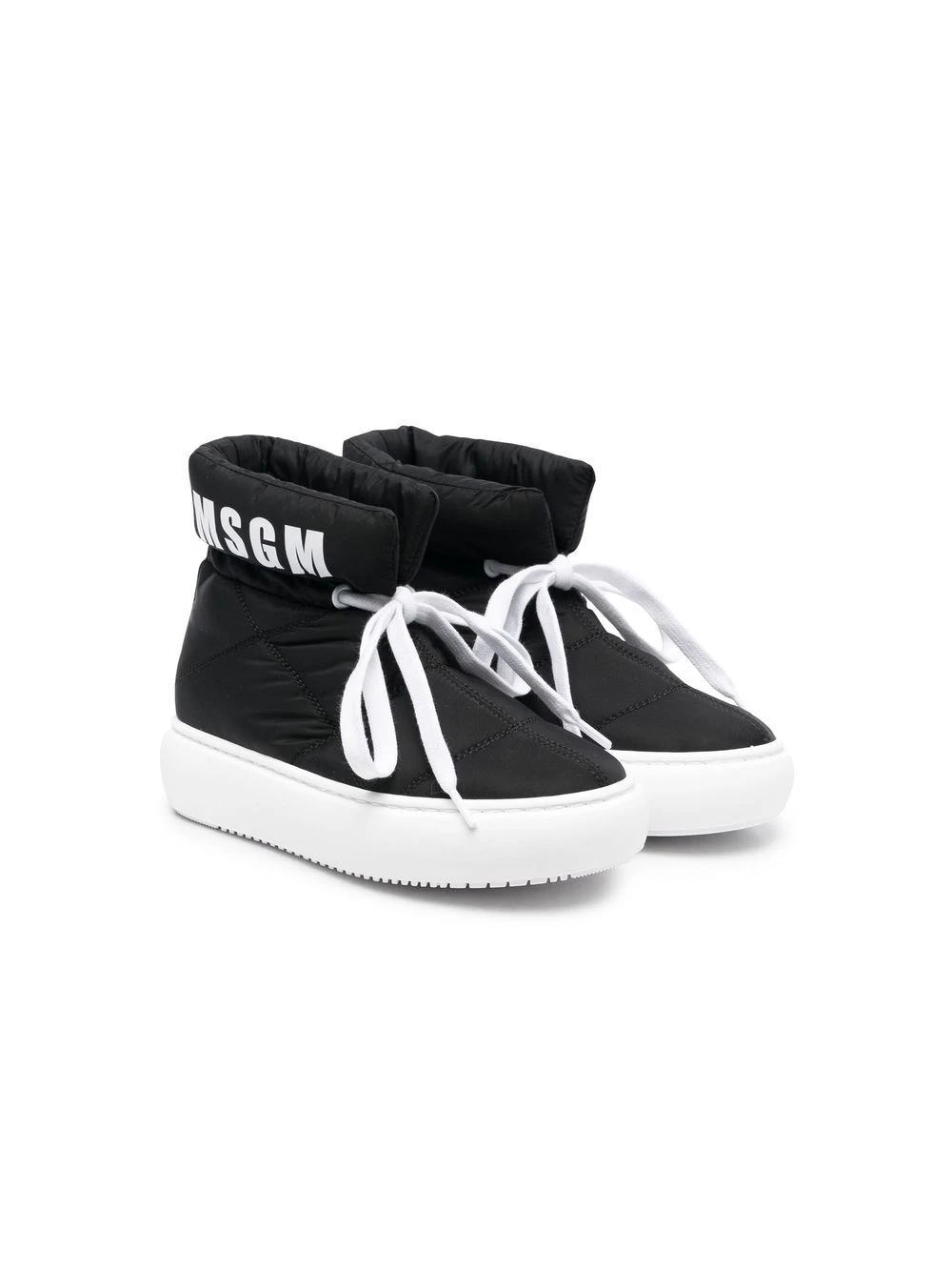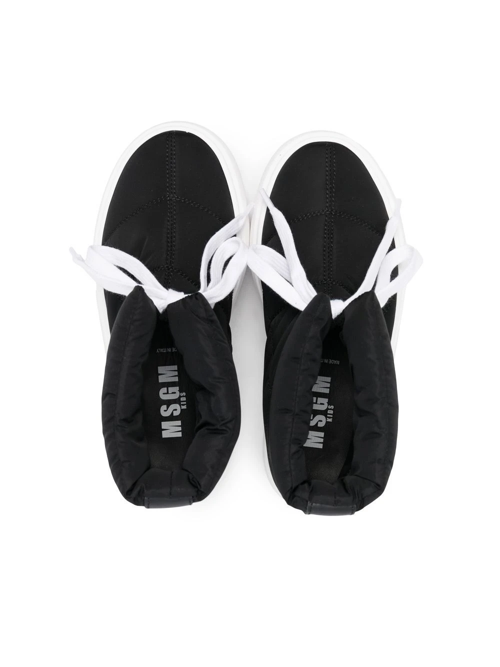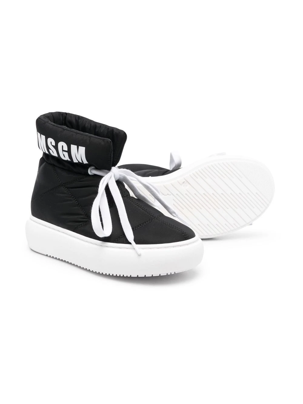 Sort/hvid, polstret design, diamantquiltet, lukning med løbesnor, logotryk i siden, rund tå, flad gummisål.