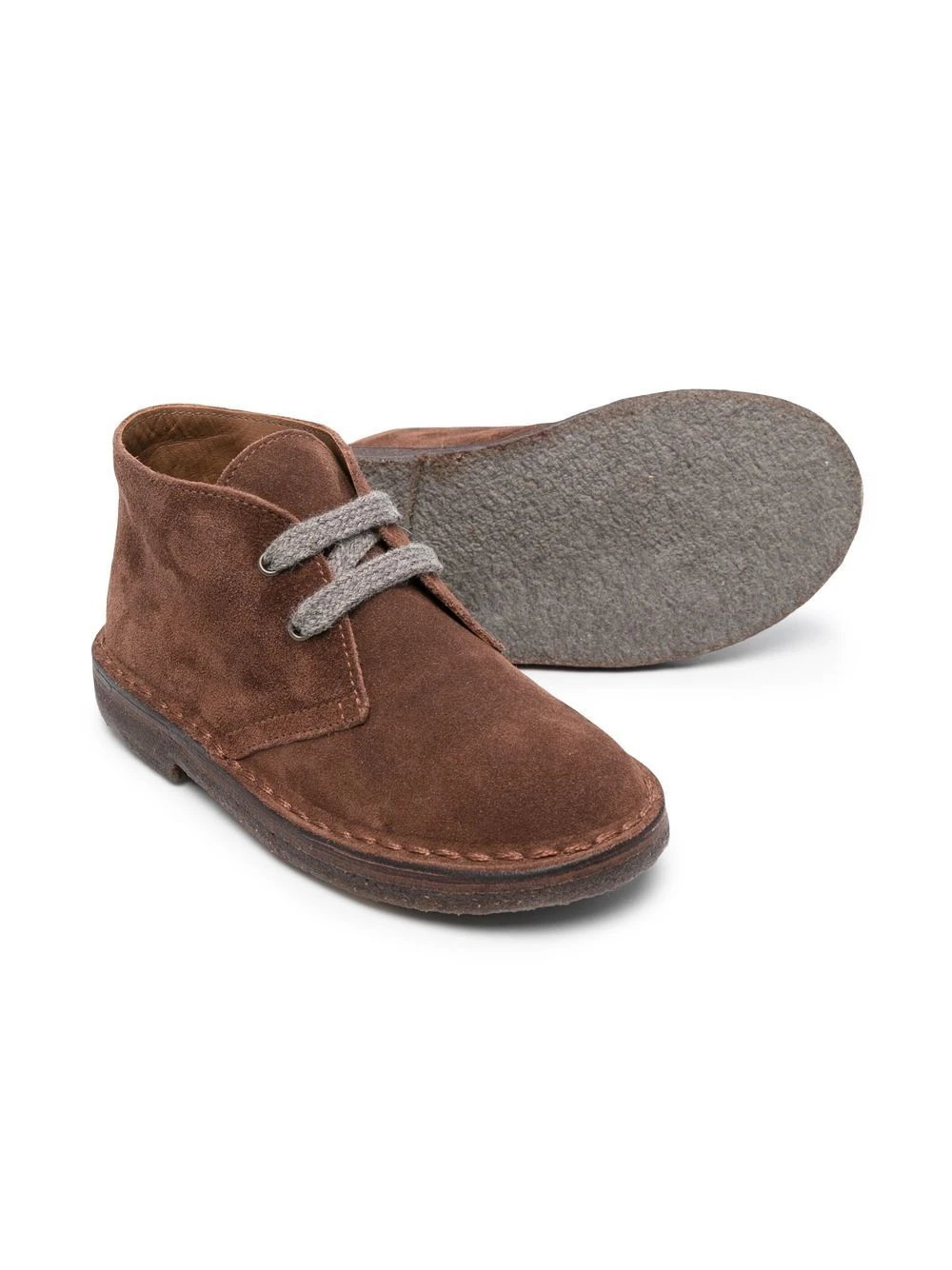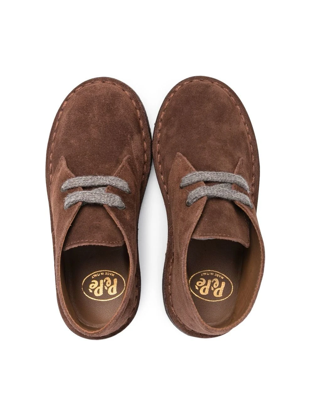 Brun, kalveskind, kalveruskind, snørelukning foran, dekorative syninger, rund tå, indersål med logo, flad gummisål.