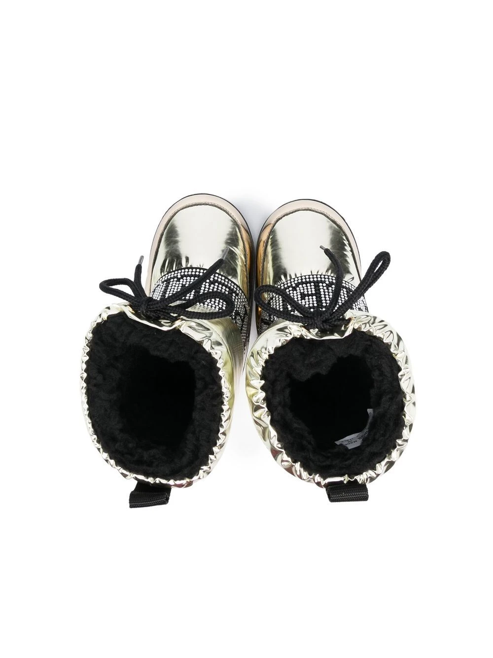 Guldfarvet, snørelukning foran, logobogstaver, rund tå, flad gummisål.