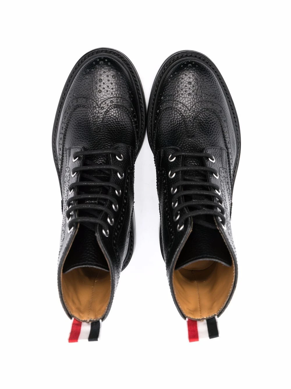 Hæltræk, snørelukning foran, rund tå, flad sål. Materiale: kalveskind.