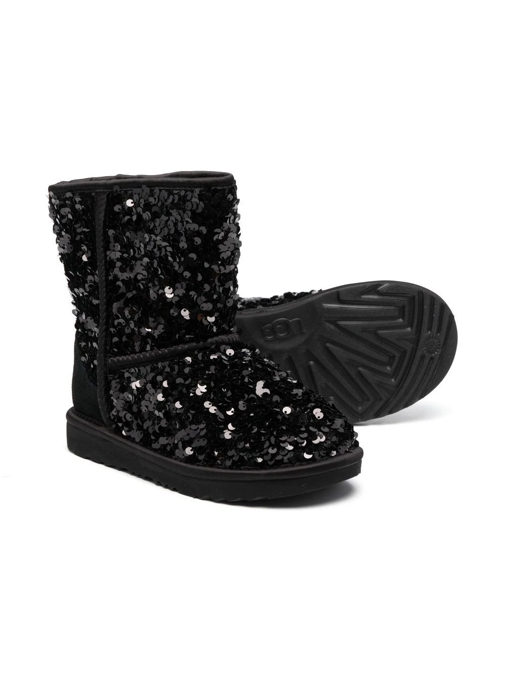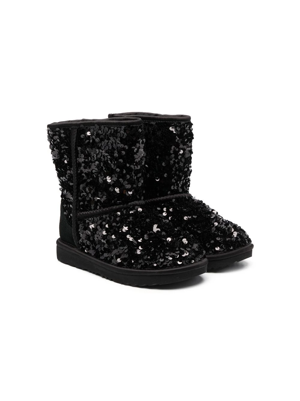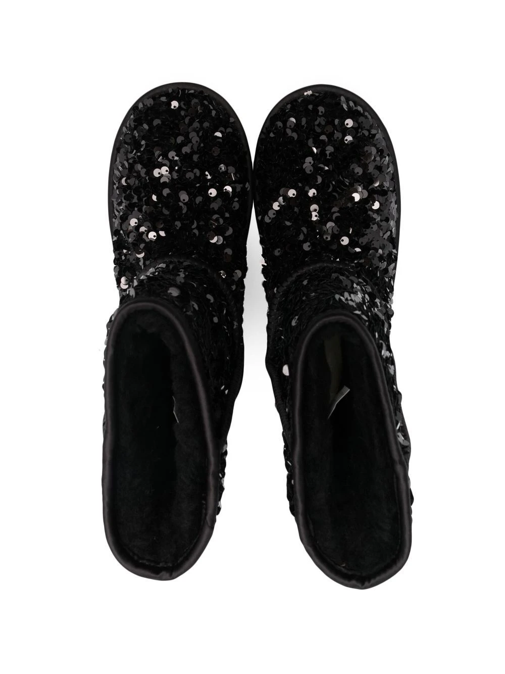 Sort, uldblanding, genanvendt polyester, lammeskindsfor, pailletudsmykning, indersål med logo, rund tå, ankellængde, rillet gummisål, pull on-design.