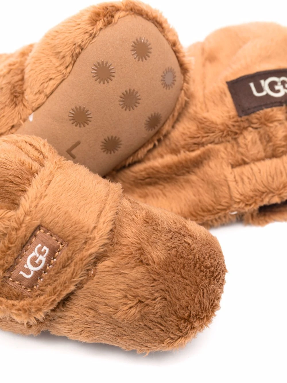 Imiteret pelsdetalje, logomærke på siden, rund tå, burrelukning foran, indersål med logo, flad sål, logomærke foran, pop up-dyreører.