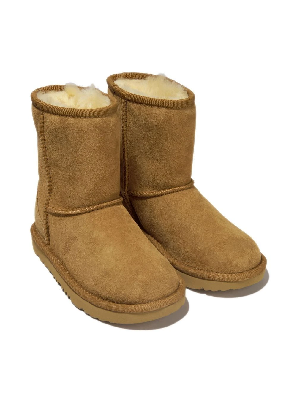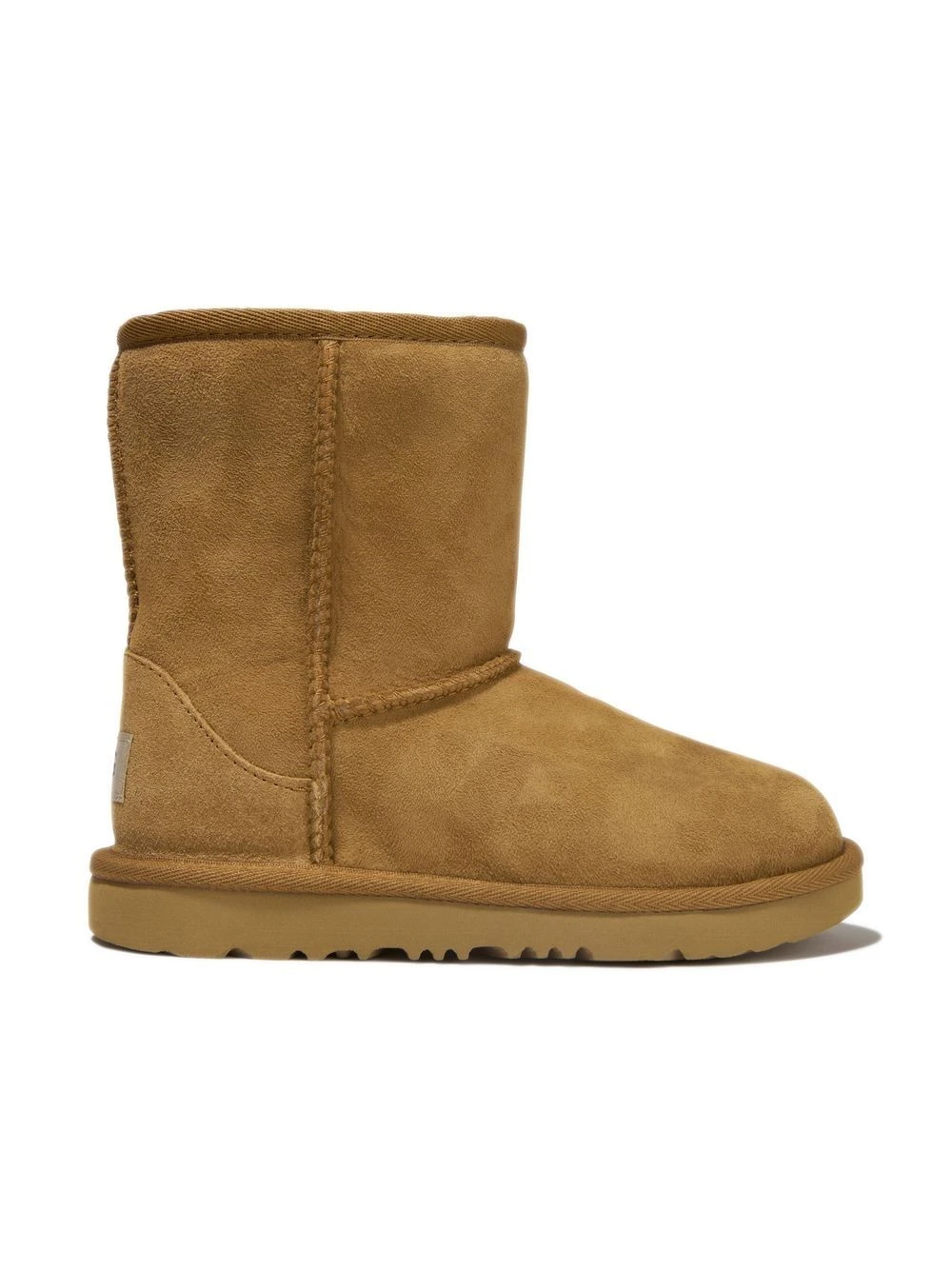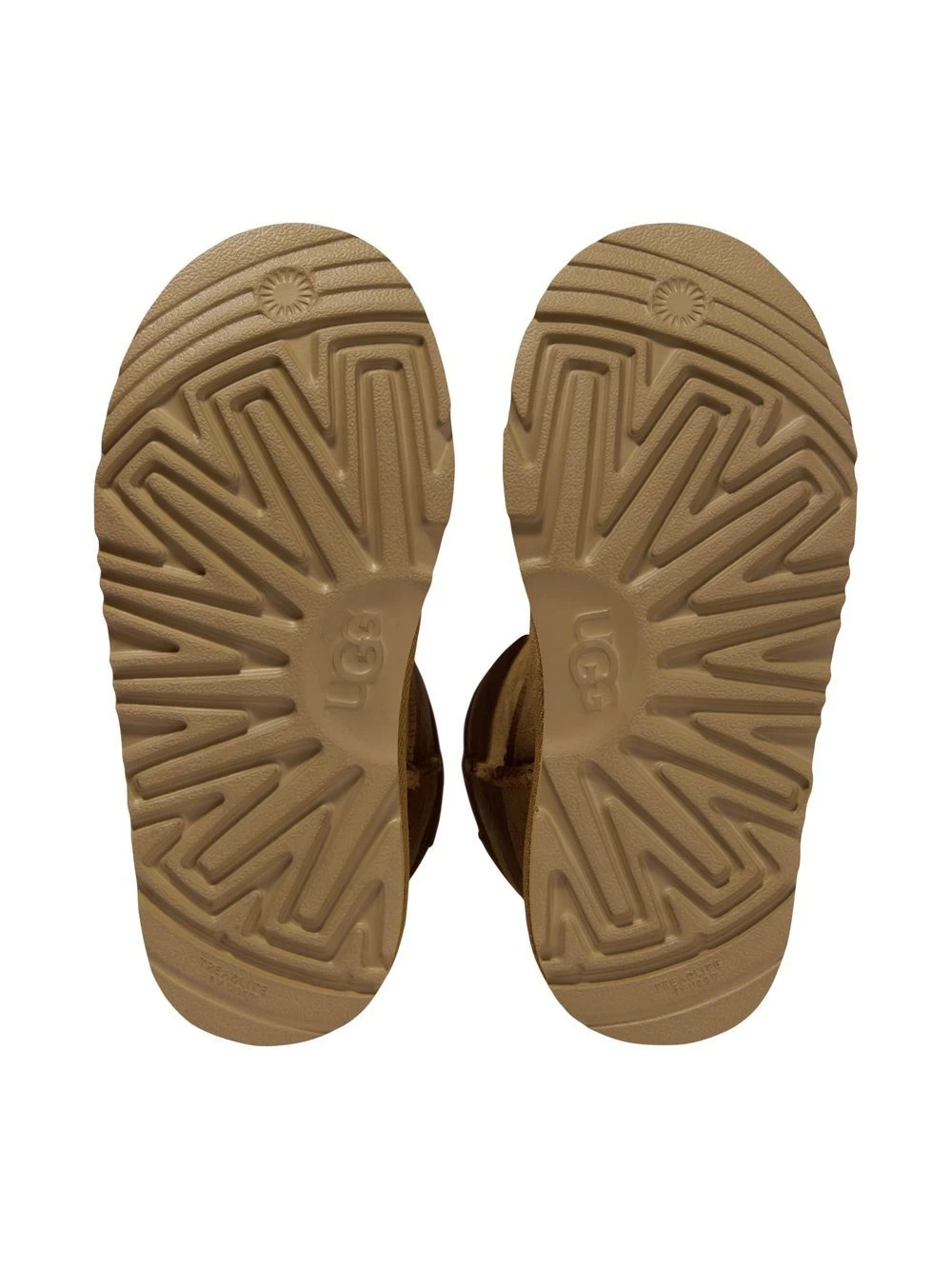 Kastanjebrun, fåreskind, logomærke bagpå, rund tå, lammeskindsfor, flad sål.